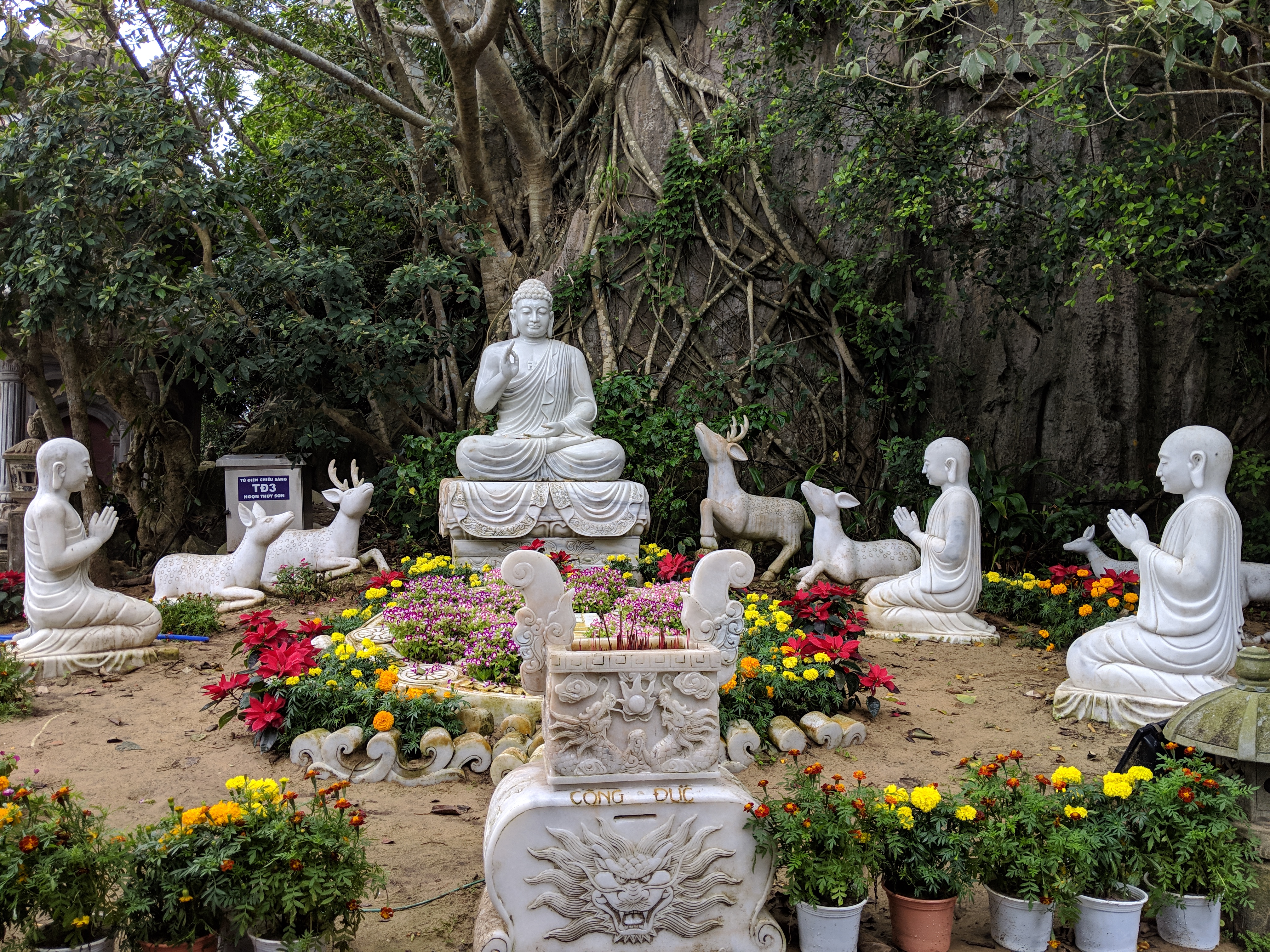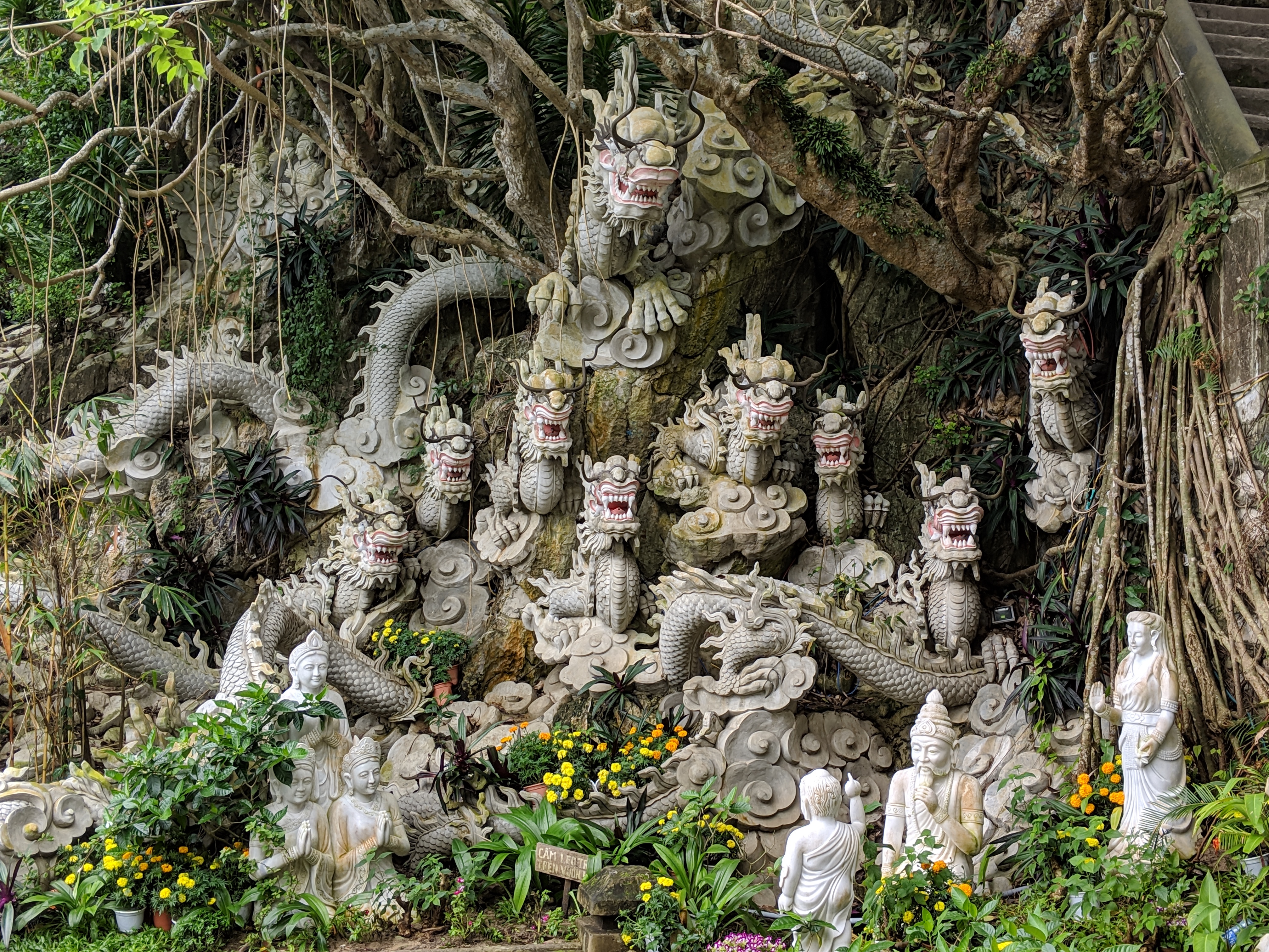 About 45 minutes into the drive, we stopped at Marble Mountain. We’ve developed a habit of intentionally not looking too many things up ahead of time, so we could be surprised. It’s mostly worked out thus far. We bought our entrance tickets and took an elevator five stories up. Once we stepped out, we were met with sweeping views, buddhas, temples, and caves. Not what you’d normally expect when you drive through a small mountain range.