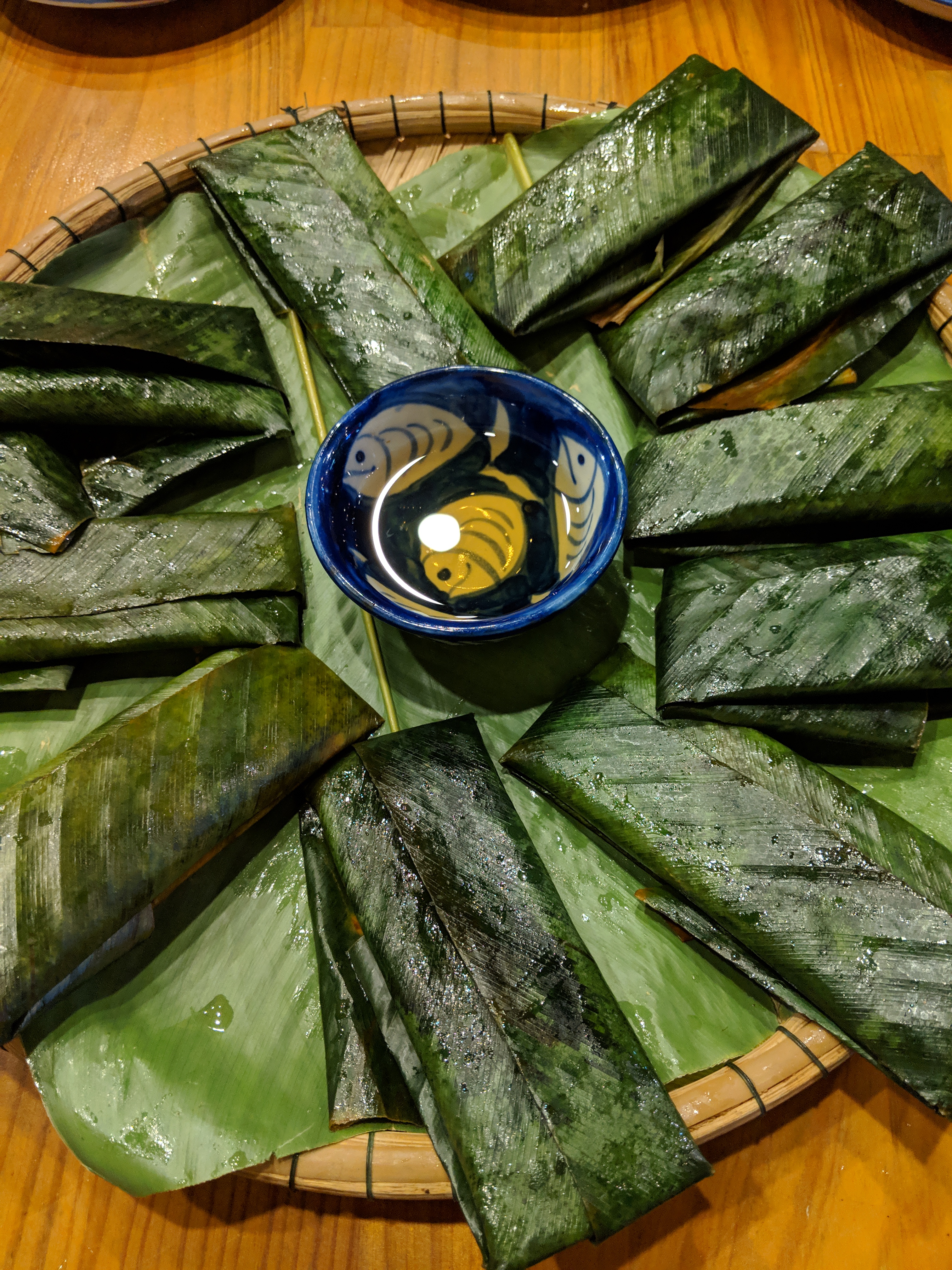 Bánh nậm at Madame Thu’s Restaurant. Rice flour stuffed with shrimp and pork, wrapped in a banana leaf, and steamed. Served with a light fish sauce.
