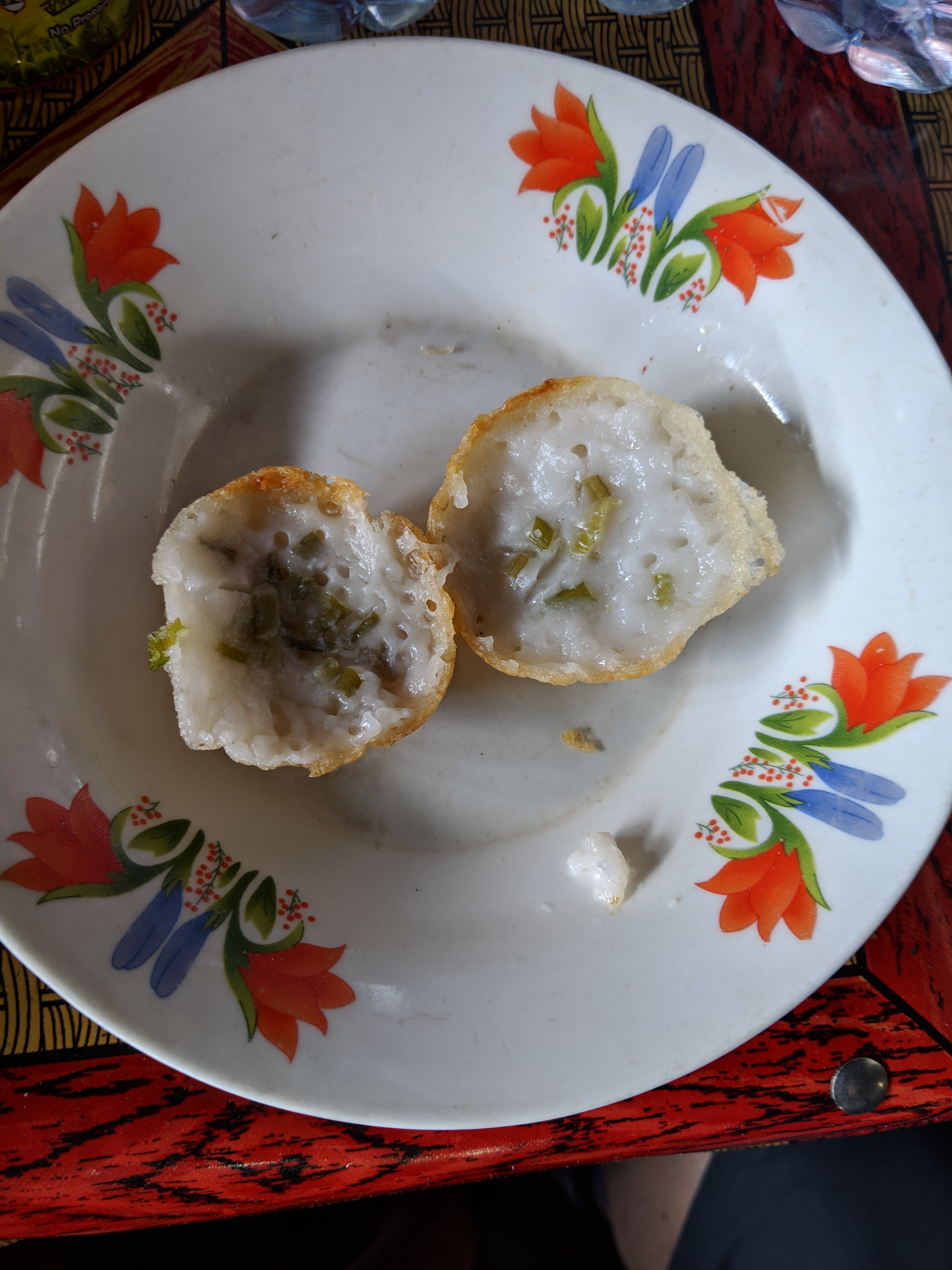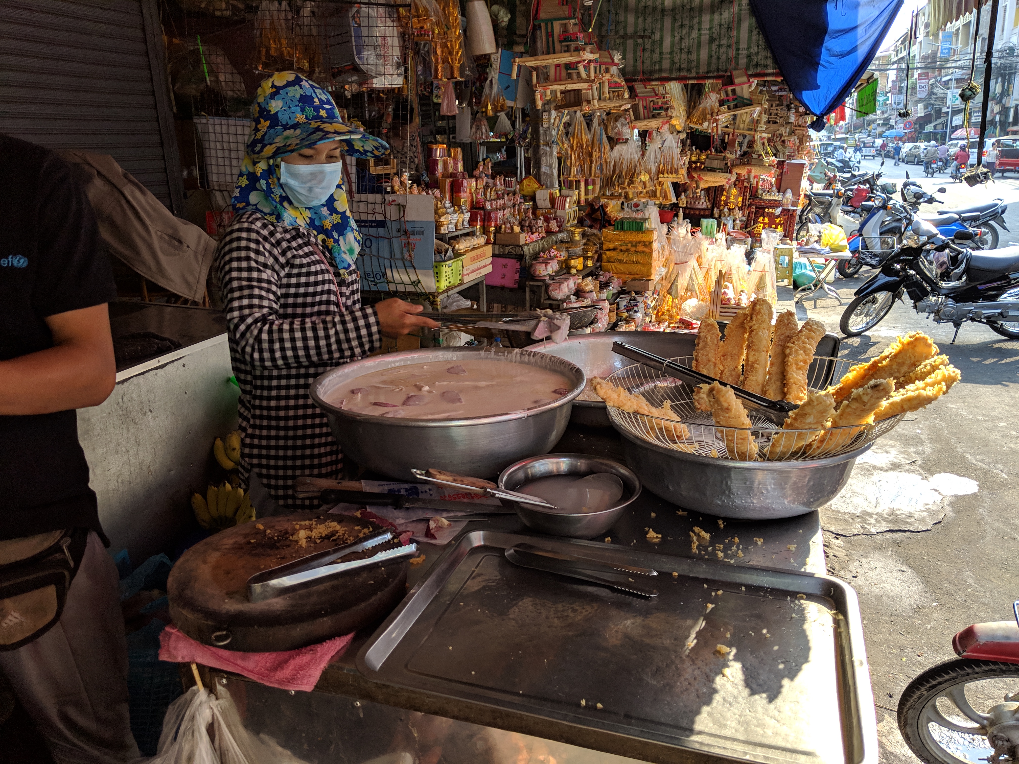A popular Cambodian breakfast is rice with bbq meat, so this dish kickstarted our morning. Rice is a staple in the Cambodian diet and is also highly respected. The verb “to eat” in Khmer actually loosely translates to “eat rice.” The people are fully aware of how rice is planted and harvested (aka human labor) and their respect is reflected in their attitude toward the grain: if you scoop yourself rice, you are expected to finish it, it should not be wasted. Of course, after learning this fun fact, our guide proceeded to tell us: “Don’t finish your plate. We have a lot of food to go.” Needless to say, we felt awkward leaving food on the plate, but our guide explained at our next stop that it’s okay because the vendors are paid a little extra for our visit. Meaning, we order three plates but he pays for four or five.