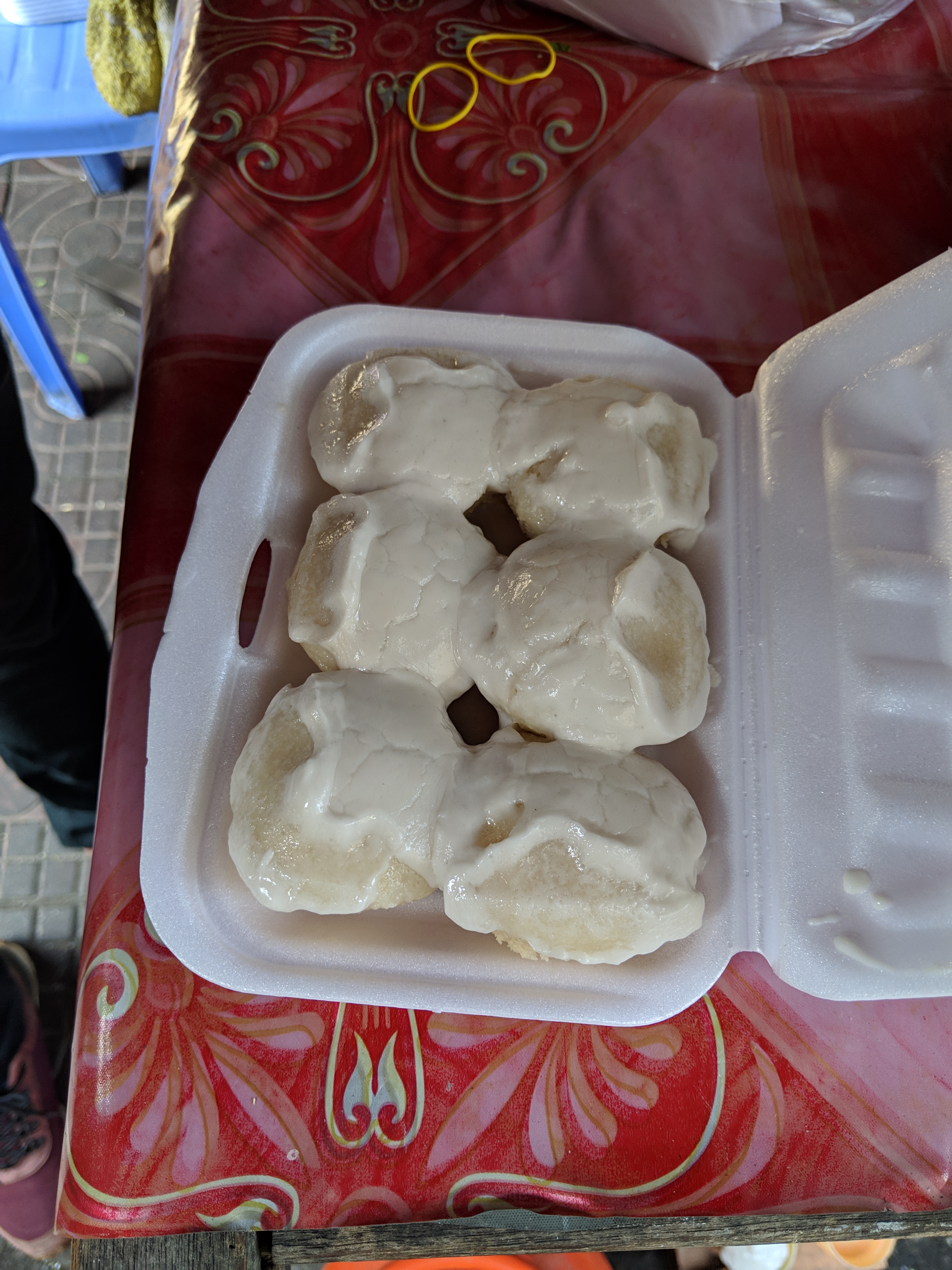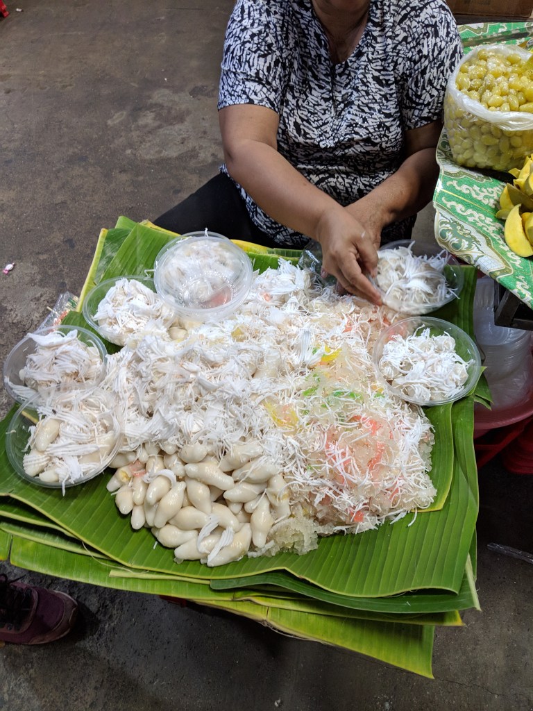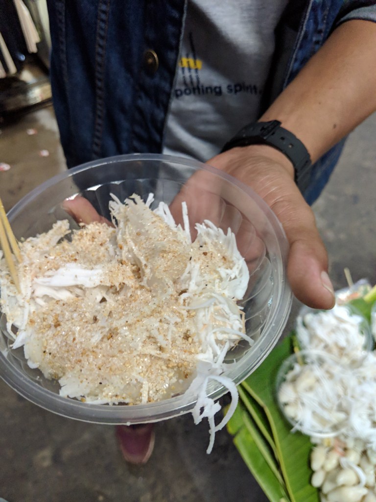 After noodles, we woke up our tuk-tuk driver and drove to another market for more snacks. We picked up some fresh squeezed orange juice (from green oranges) and once inside the market, ate something very sweet. Honestly, I don’t know exactly what it was but it had something to do with coconut shavings, palm sugar, and brown sugar. It was way too sweet for my taste, but the rest of our group enjoyed it.