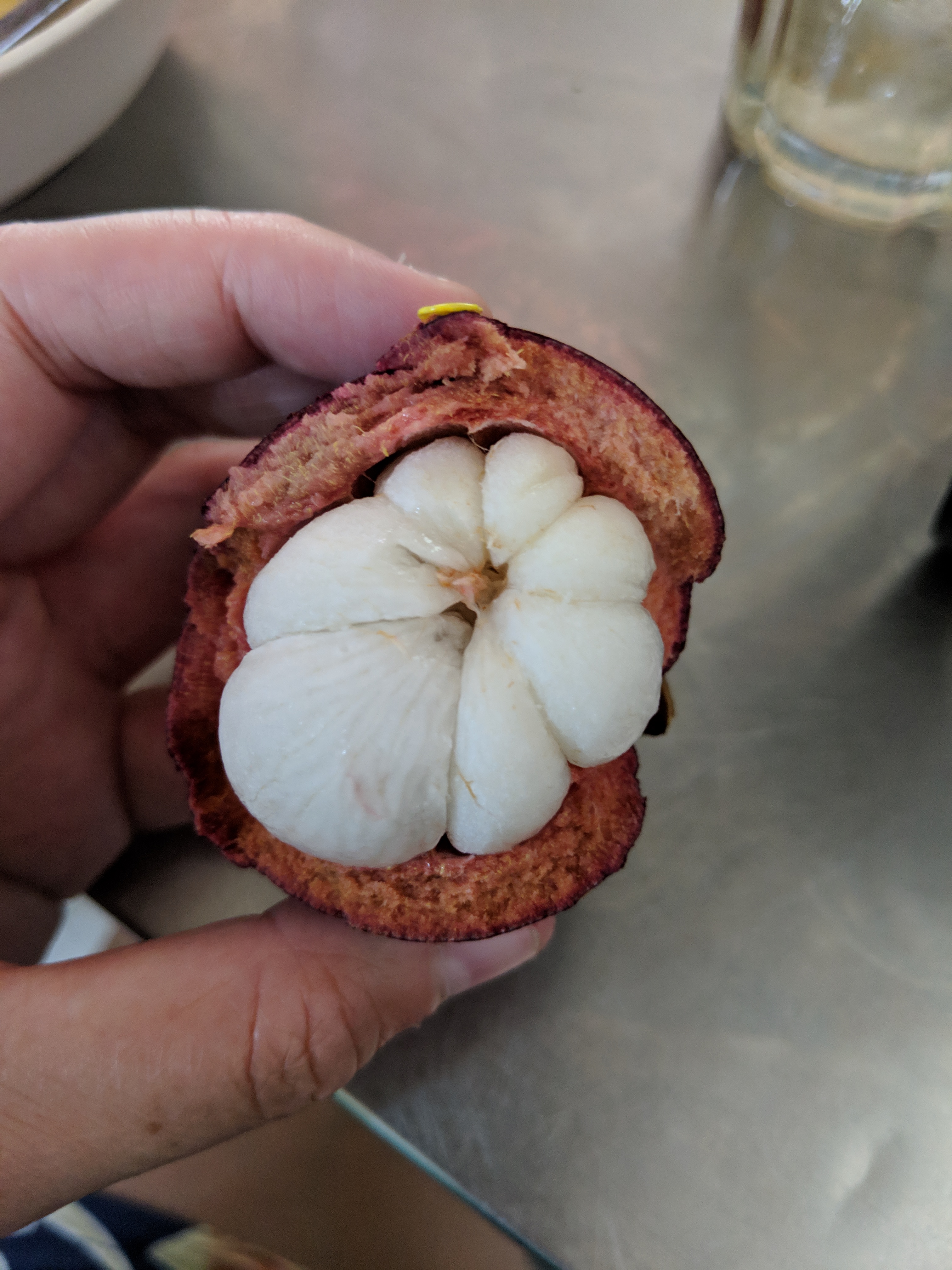Finally, as if we couldn’t fit any more food into our bellies, we finished off with some Cambodian fruit and a small dessert. I don’t remember all the fruit we ate, but our favorite was a small fruit called mangosteen. It’s like a mix between lychees and peaches. Our dessert was a coconut rice cake, or khmer num krok. They are served literally right of the pan so they are incredibly hot, and you dip them into some cool coconut milk. Absolutely divine.