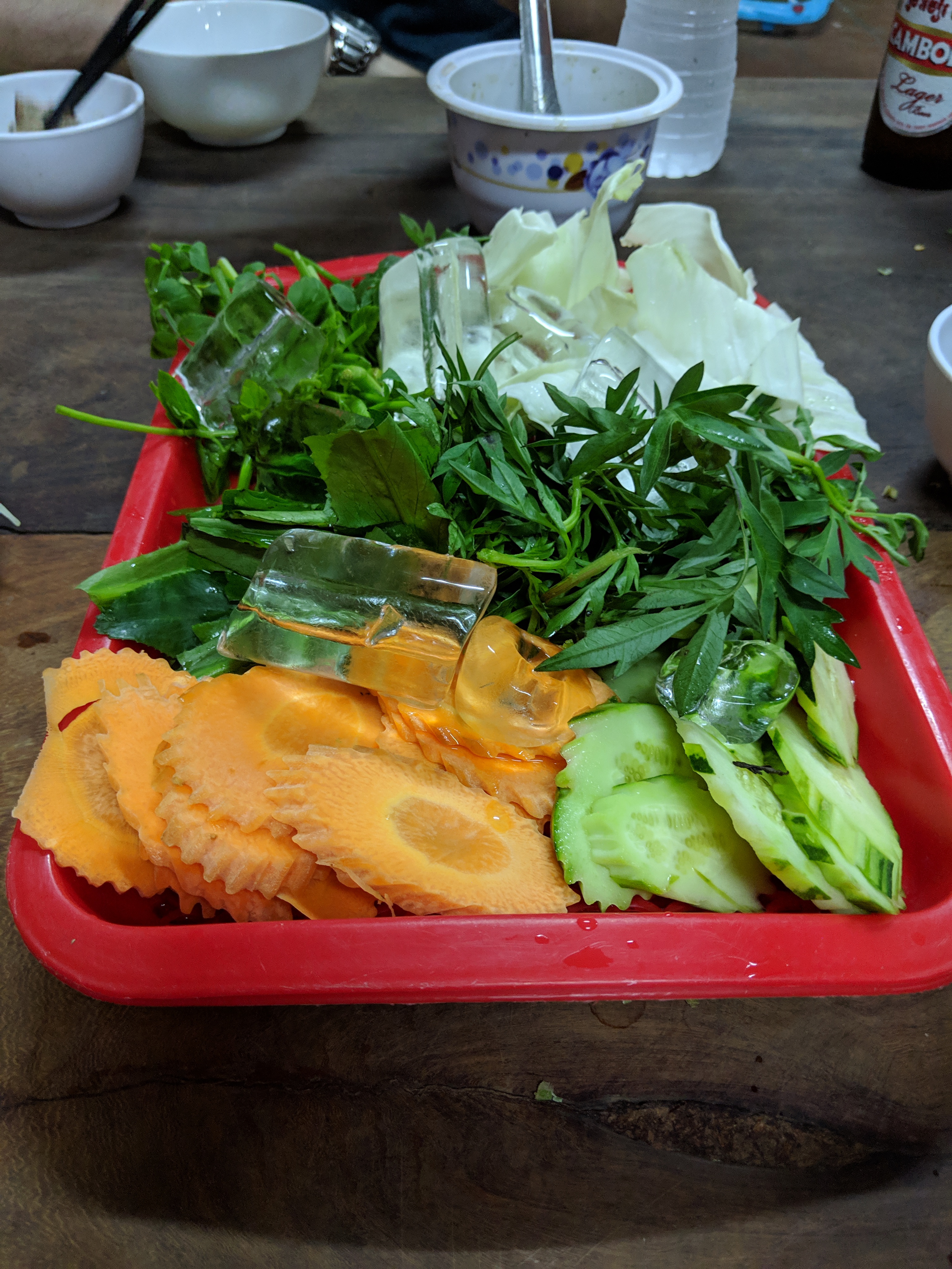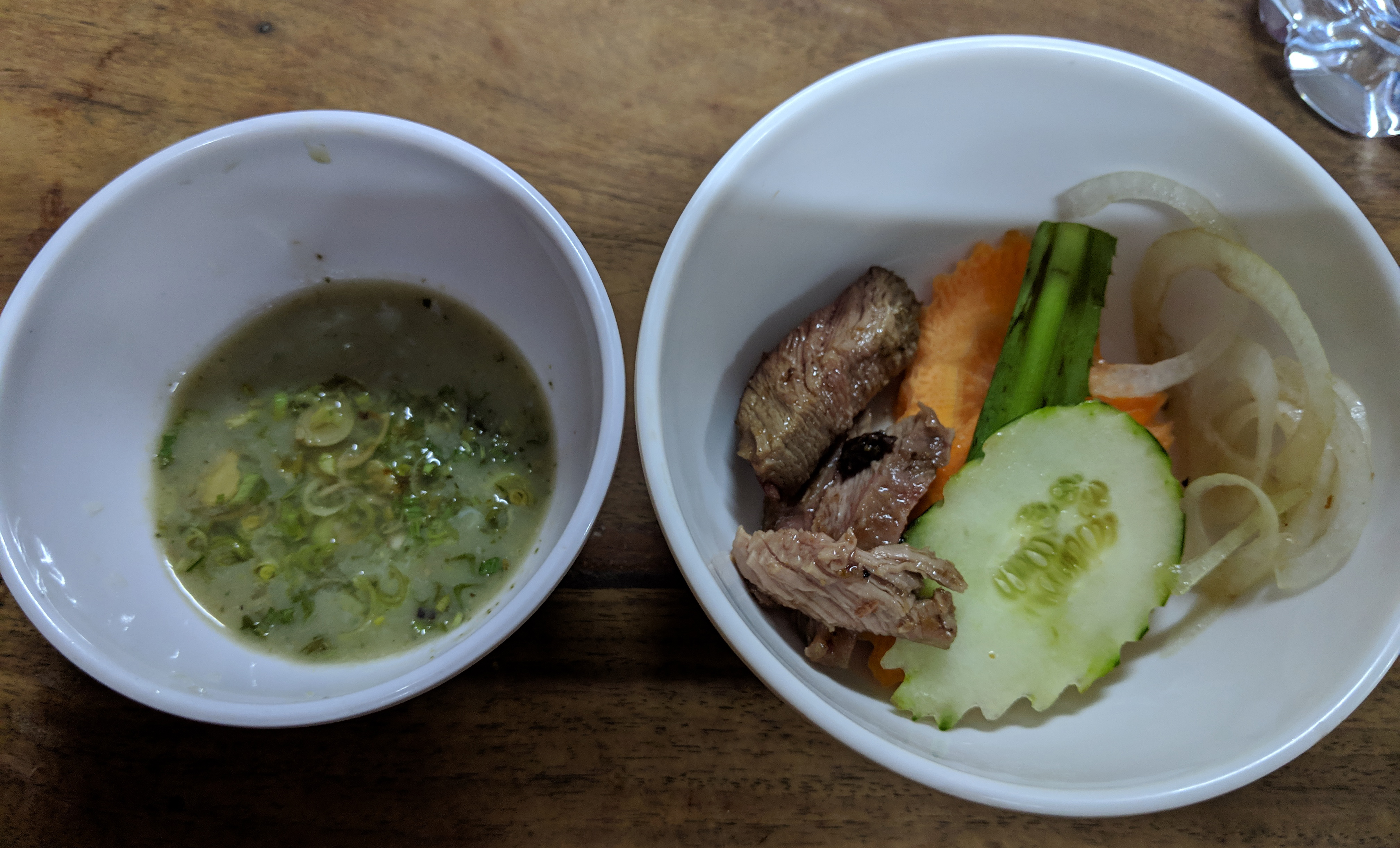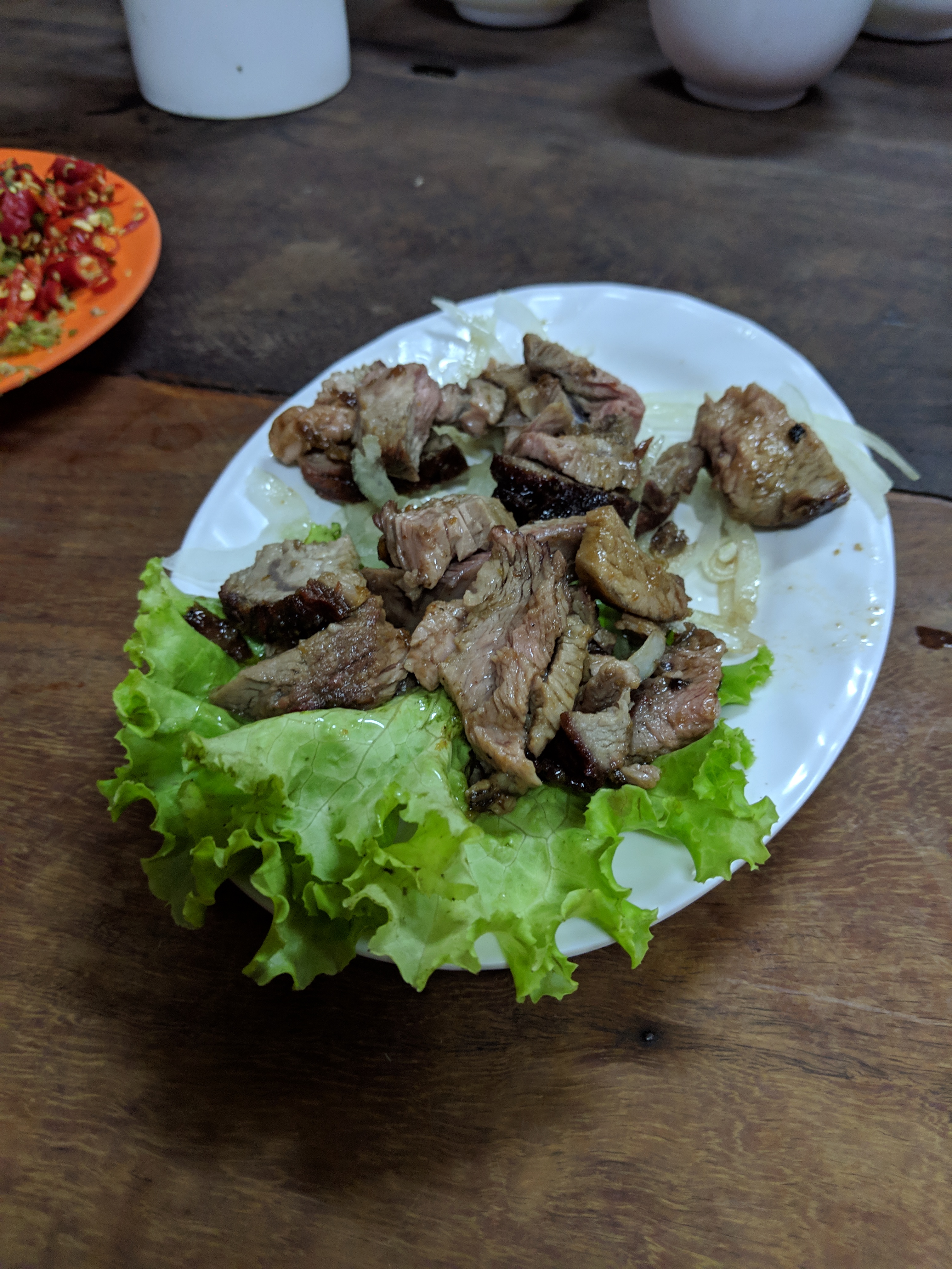 We started lightly, snacking on a dish known as sach ko ang. You take toasted bread (which also has butter and sugar on it), put on some marinated beef, and top it off with picked green papaya salad. Sounds odd, but this was one of our favorite dishes of the night.