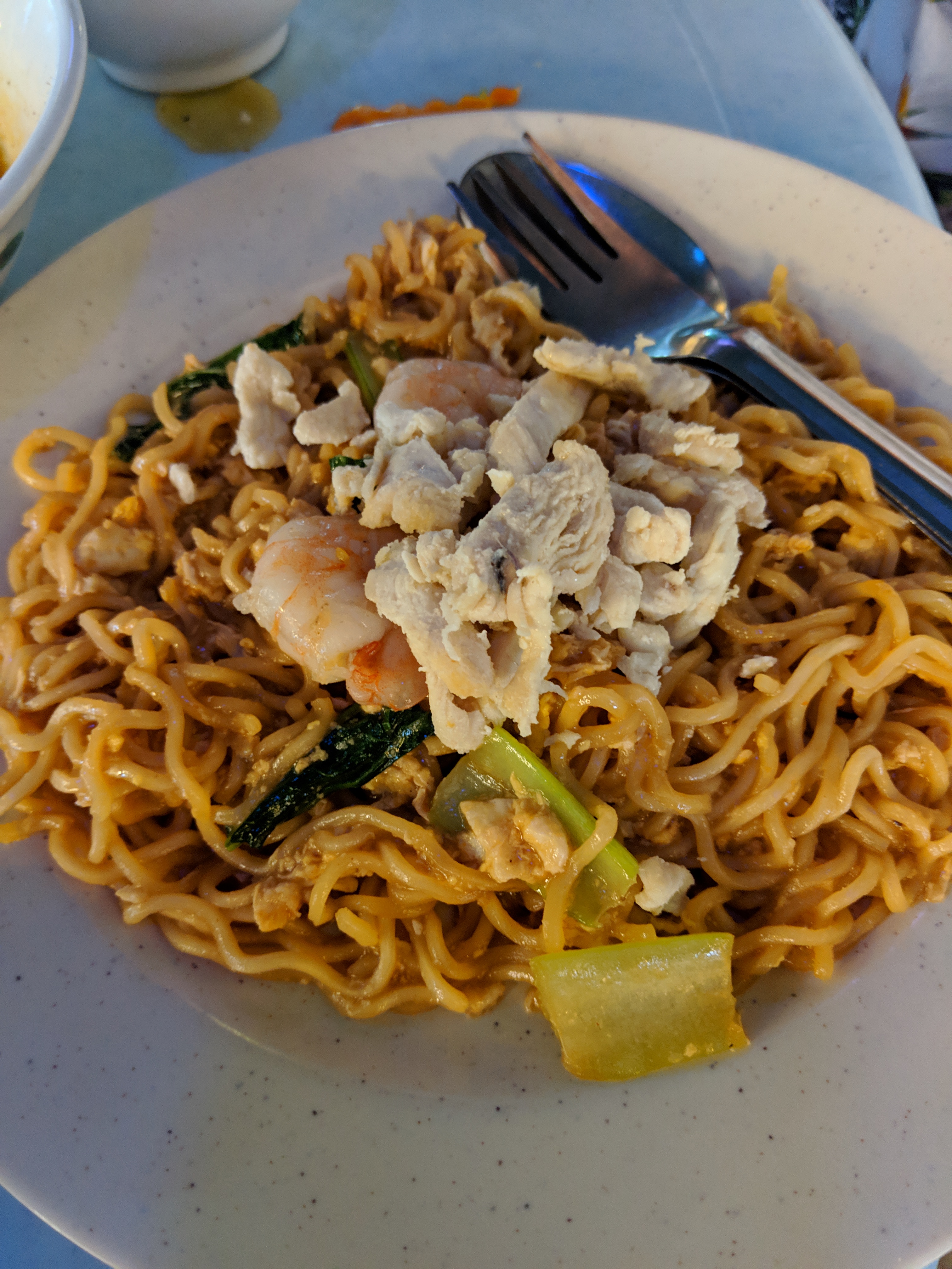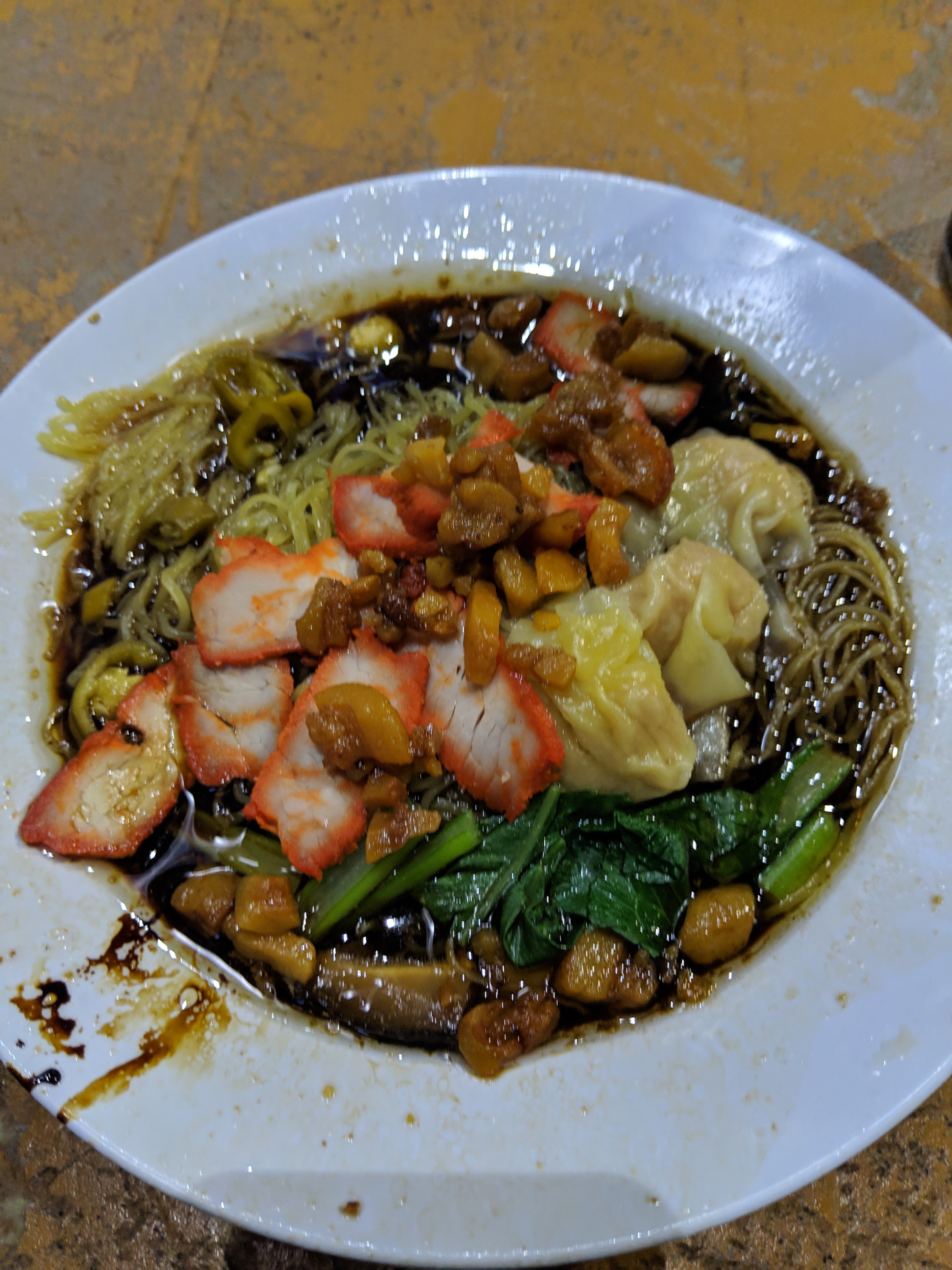 At the time, I didn’t know what I was eating, but thanks to the internet I figured out it was something called wantan mee. It has noodles, won tons, char siew (chinese bbq pork), vegetables, and what I believe to be fried pork fat on top. It’s smothered in some kind of dark gravy sauce and is so, so good! The vendors are pros, whipping up sauces and ingredients with their eyes closed. You order, pay, and find a seat at a nearby table.