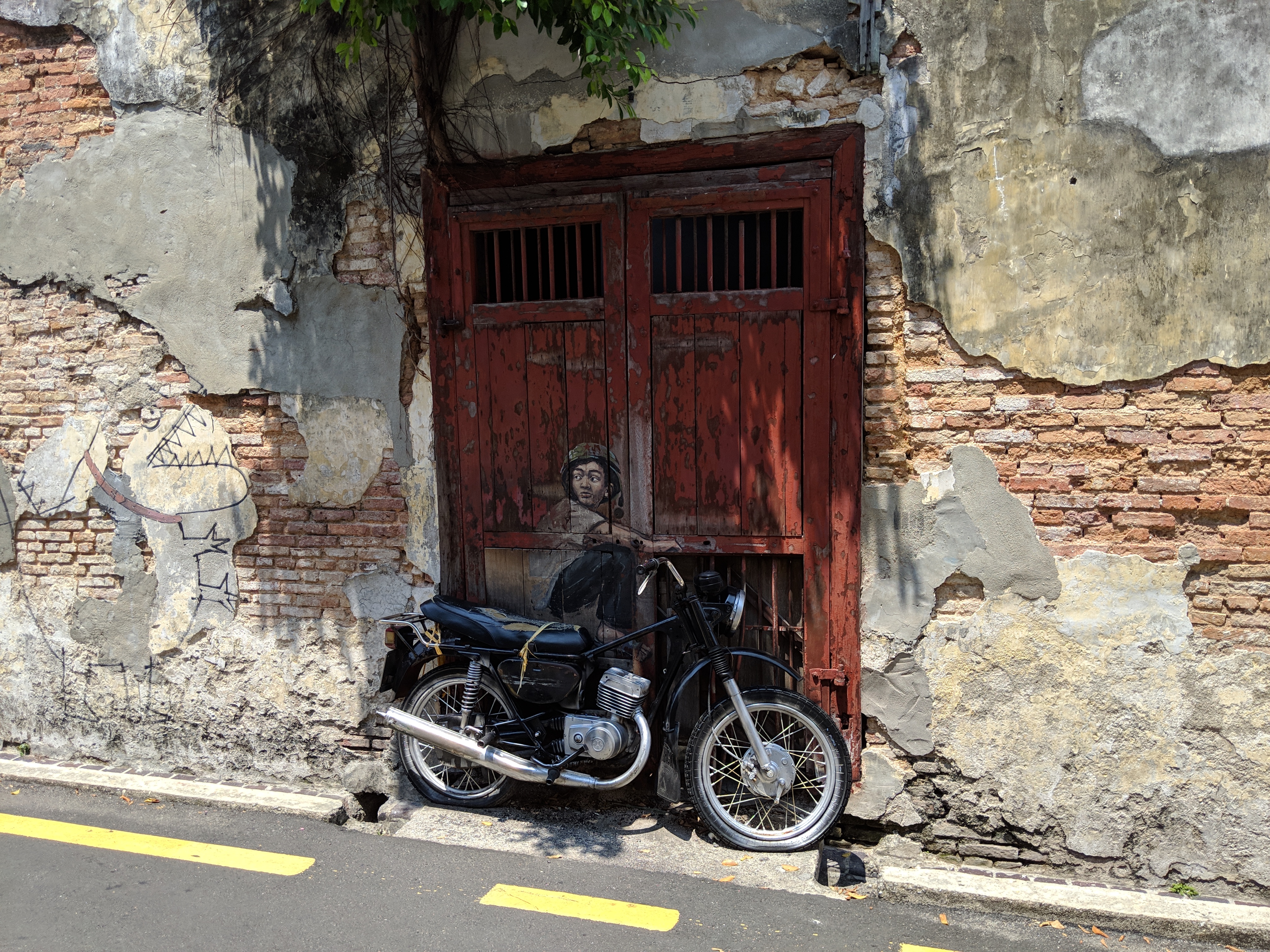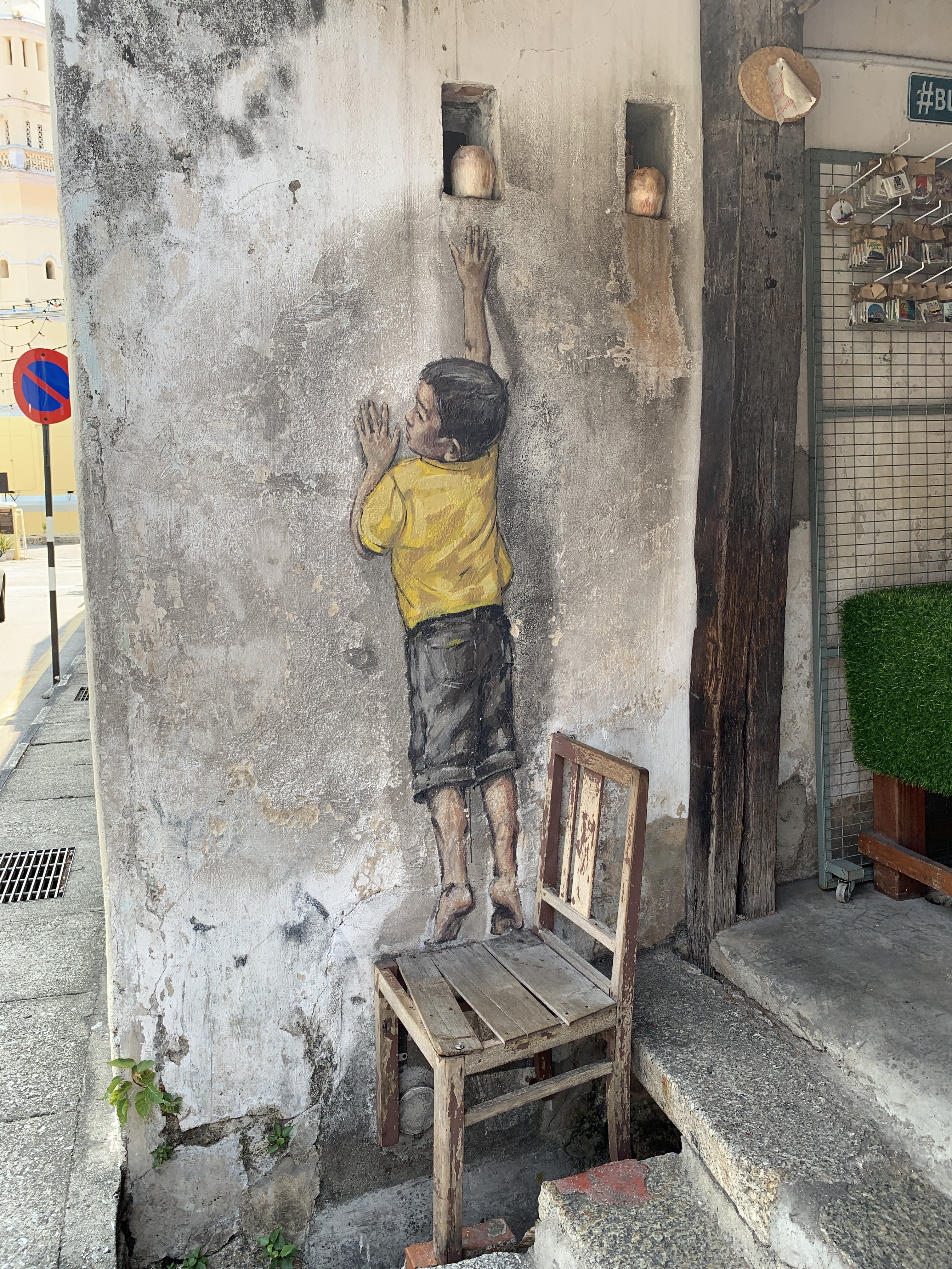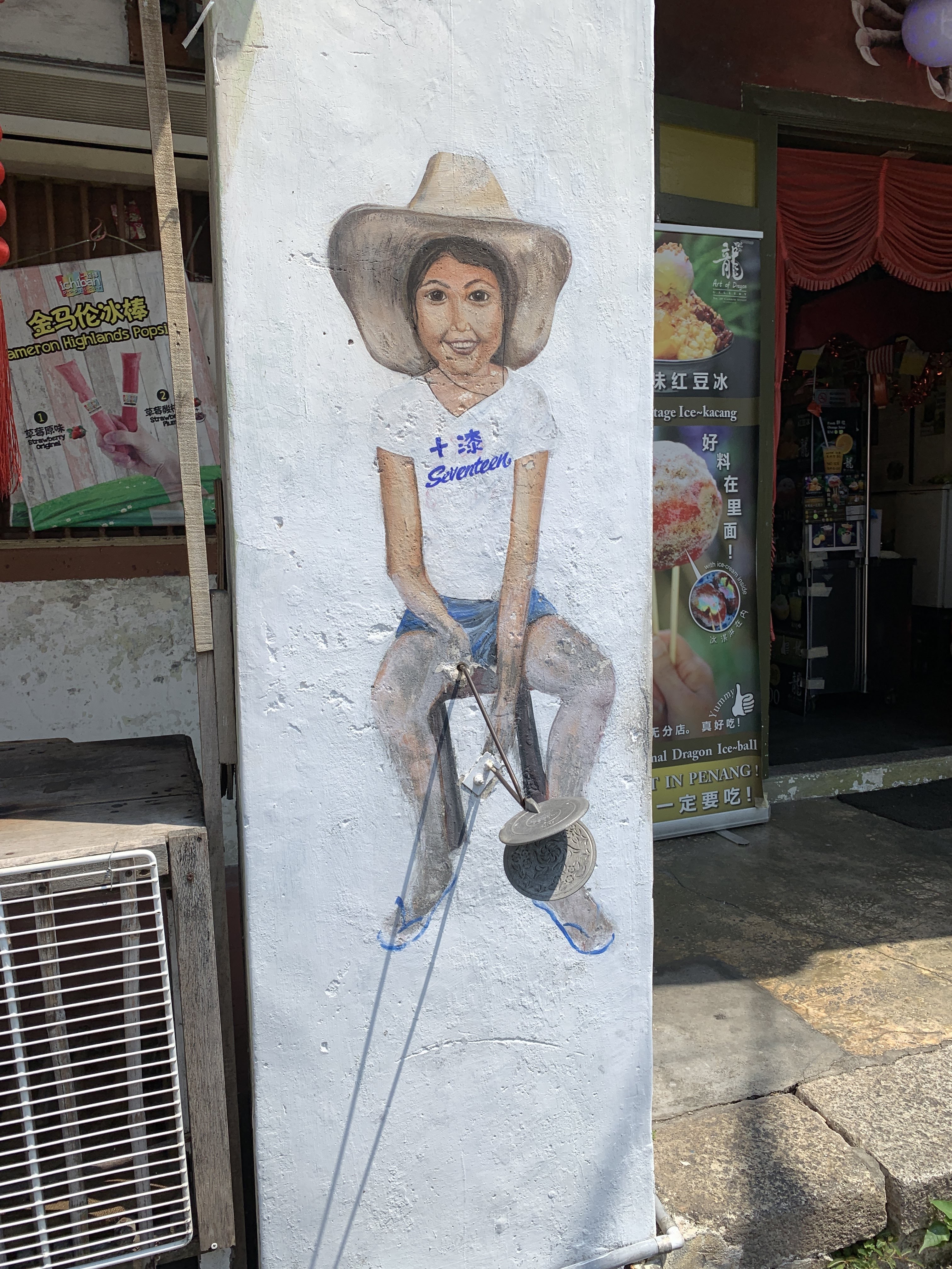 We started with a self-guided walking tour around our neighborhood, fighting the heat and humidity to find some art and see some sites. Around the corner from us were two famous areas, Little India and Pitt Street. Little India is self-explanatory of course. Besides Indian restaurants and businesses, it’s also home to many of the street art murals. In 2012, Lithuanian artist Ernest Zacharevic painted a number of scenes around George Town depicting local life and culture. People loved it, so more art was added over time.
