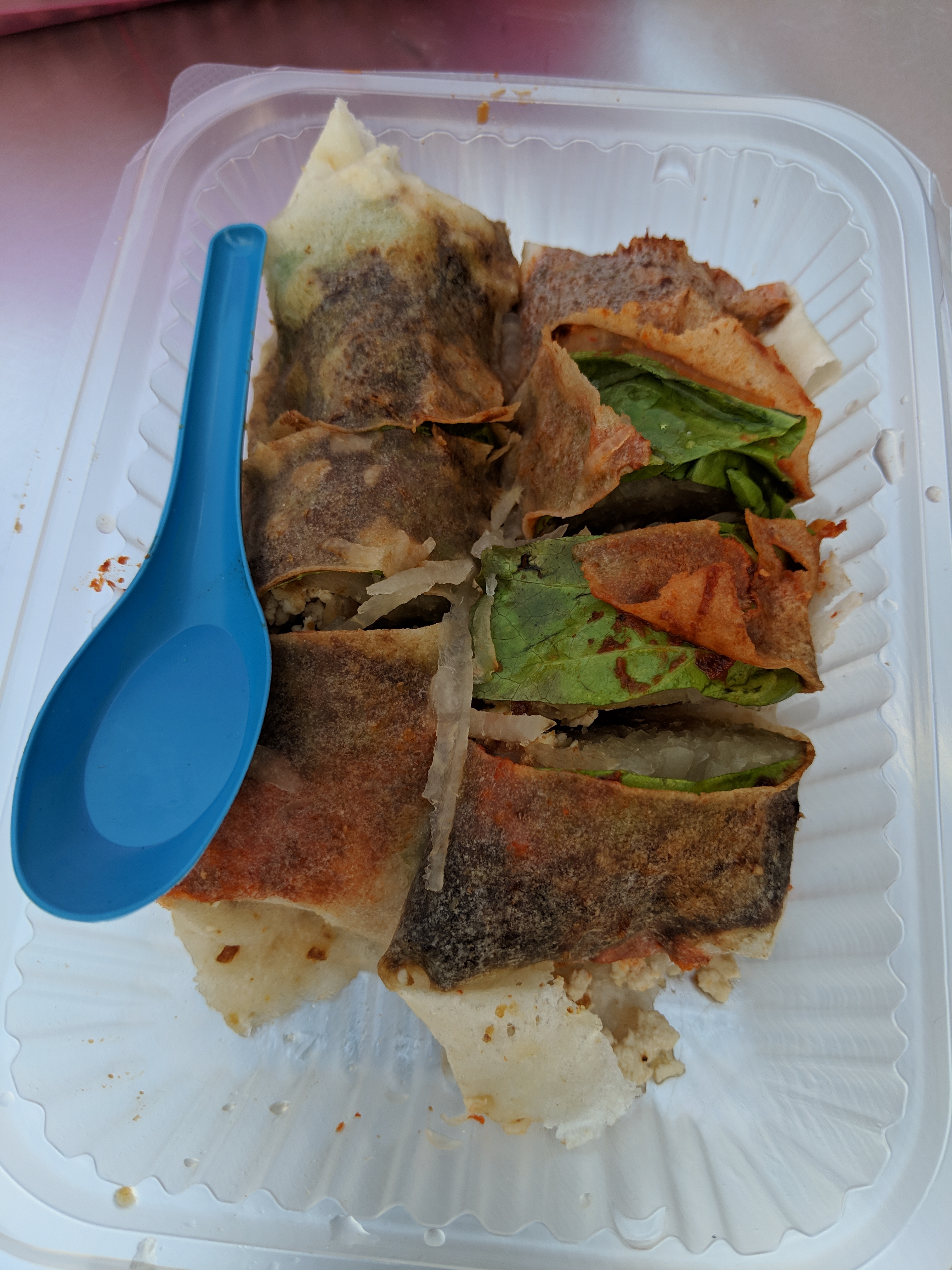 Mark decided to wing it and picked something that wasn’t in English and the picture was not of the best quality. It looked like a spring roll, so maybe it is a spring roll? Well, we were half right! It’s popiah, a Fujianese/Teochew-style fresh spring roll. A paper-thin crepe-like outer shell is filled with stewed julienned yam bean, diced beancurd, spring onions, and finished with brown bean paste.