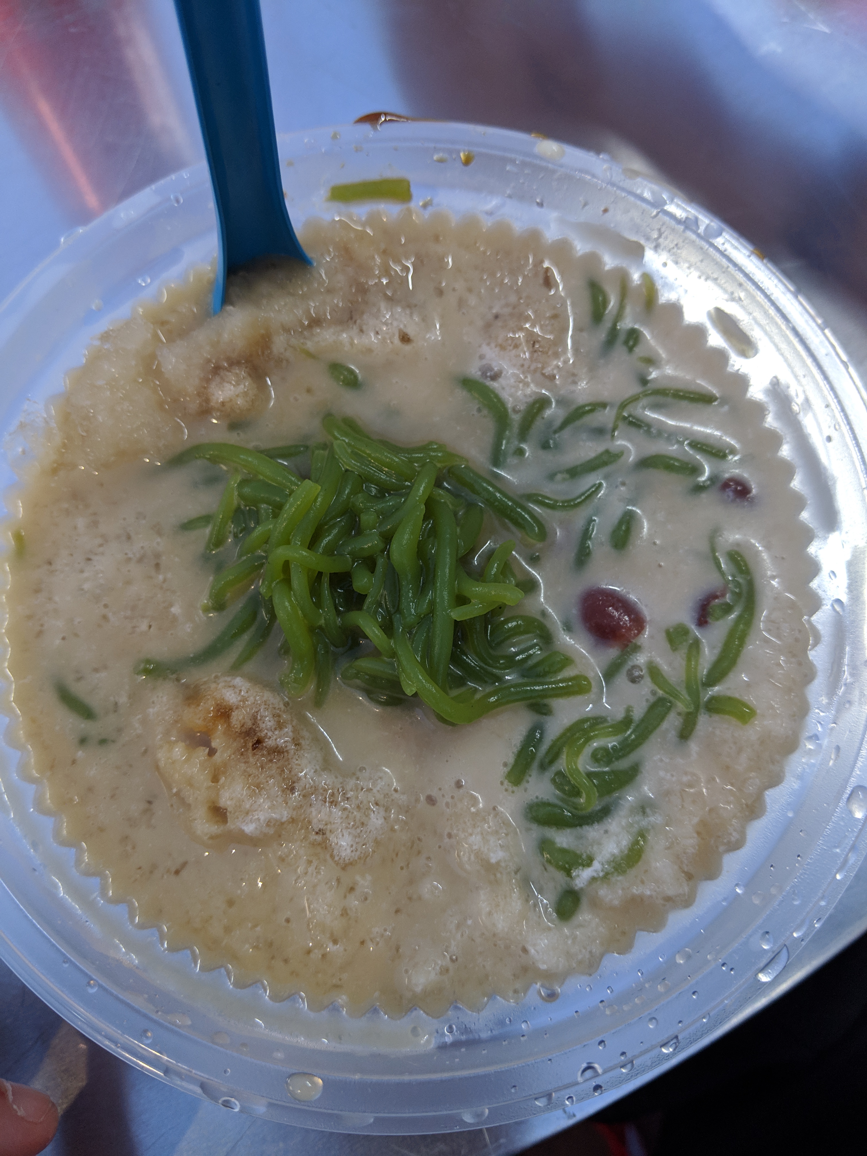 We were told to try the local dessert, cendol, so we ordered one. It’s an iced dessert with droplets of worm-like green rice flour jelly, coconut milk, palm sugar syrup, and sweetened red azuki beans. It was gross. It was mildly sweet but very cold, and full of weird, contradictory textures. (Mark’s note: It tasted as though you finished all but 5% of your meal, put your bowl of remnants in the sink, ran some cold ice water over it, and then decided to finish your meal anyway.) I, Isabel, think that’s too mean of description. I honestly believe we went to the wrong vendor. As always, I’m happy we tried it, because now we can say we’ve eaten it.