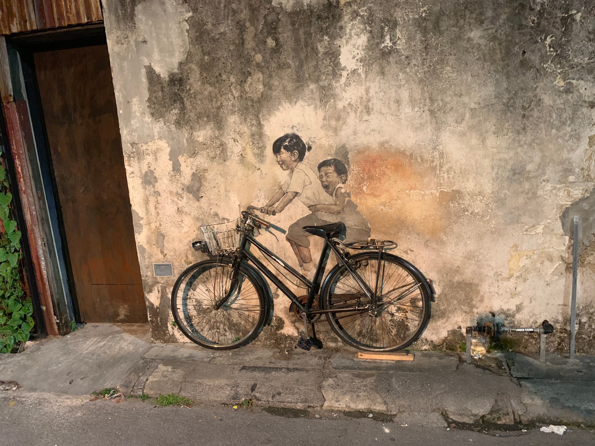 We started with a self-guided walking tour around our neighborhood, fighting the heat and humidity to find some art and see some sites. Around the corner from us were two famous areas, Little India and Pitt Street. Little India is self-explanatory of course. Besides Indian restaurants and businesses, it’s also home to many of the street art murals. In 2012, Lithuanian artist Ernest Zacharevic painted a number of scenes around George Town depicting local life and culture. People loved it, so more art was added over time.