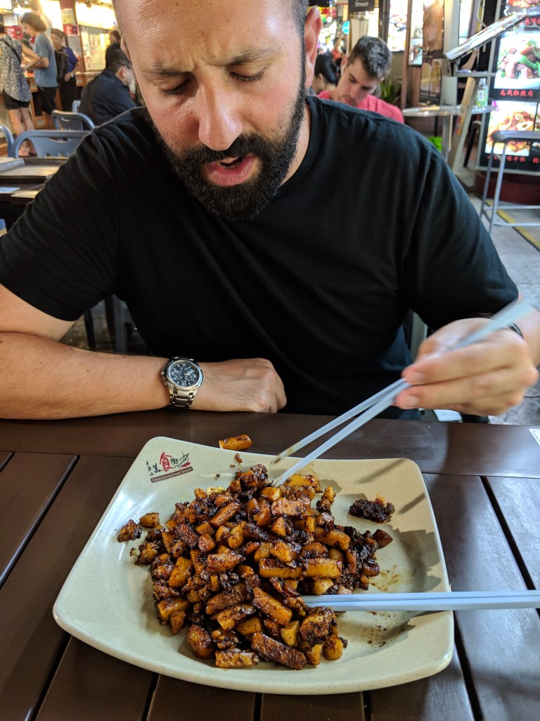 Our last two nights in Singapore ended in Chinatown on Food Street. After spending bigger bucks during the day, it was refreshing to return to the hawker stalls and food carts that characterized so much of our time in Southeast Asia. Also the reason why we returned here a second time is because our food was that good the first go around. When you look up unique food to try in Singapore, you will come across fried carrot cake. It’s not what you think. Although initially disappointed to learn that this was neither cake nor did it actually include carrots, this delicious treat comes in two flavors: black (sweet) or white (salty). I opted for the sweet, naturally. Stir-fried cubes of radish and rice flour, served with egg, cooked in a wok with sweet dark soya sauce. It was so good! I’d love to try my hand at this once we’re back Stateside.