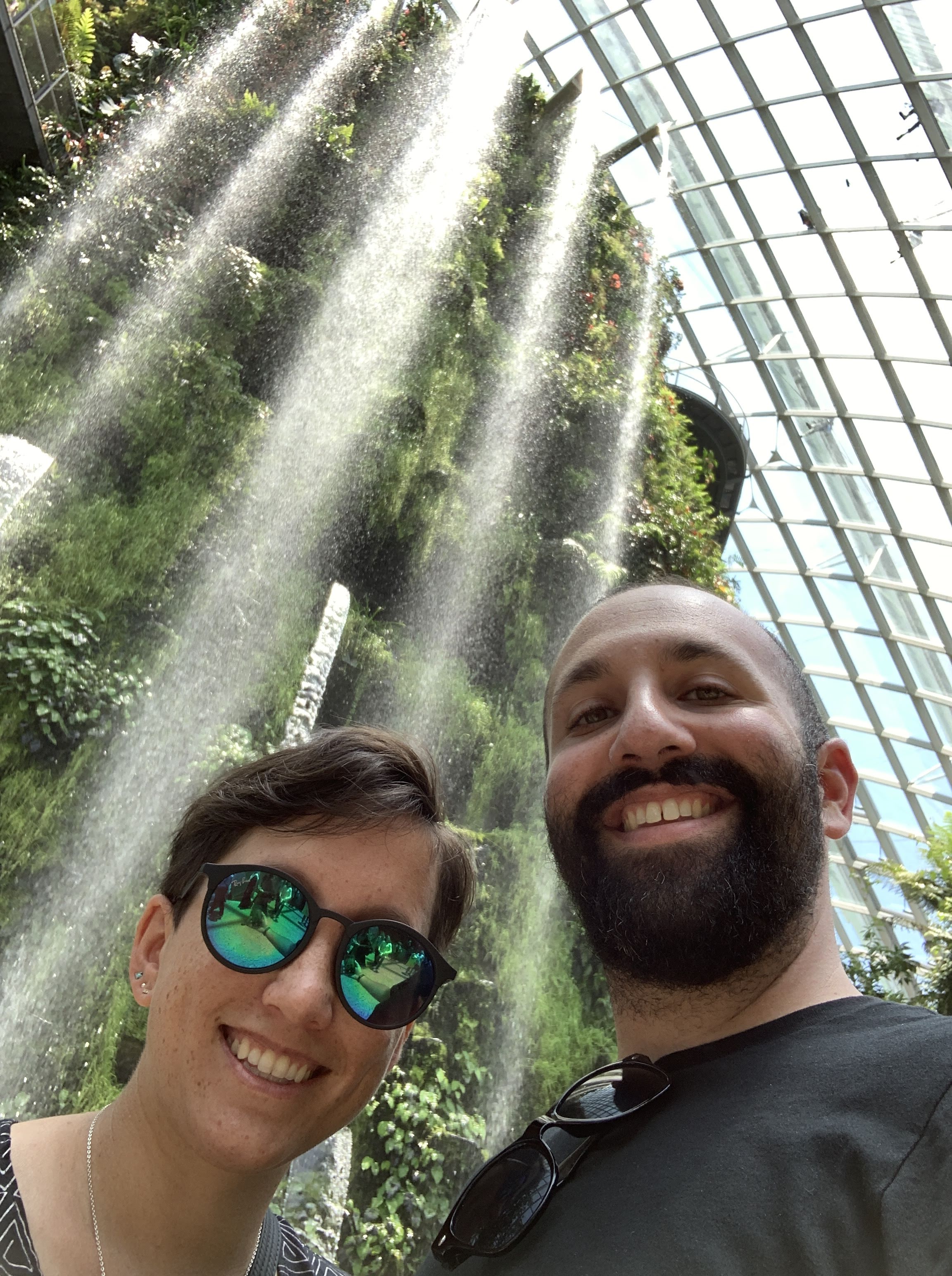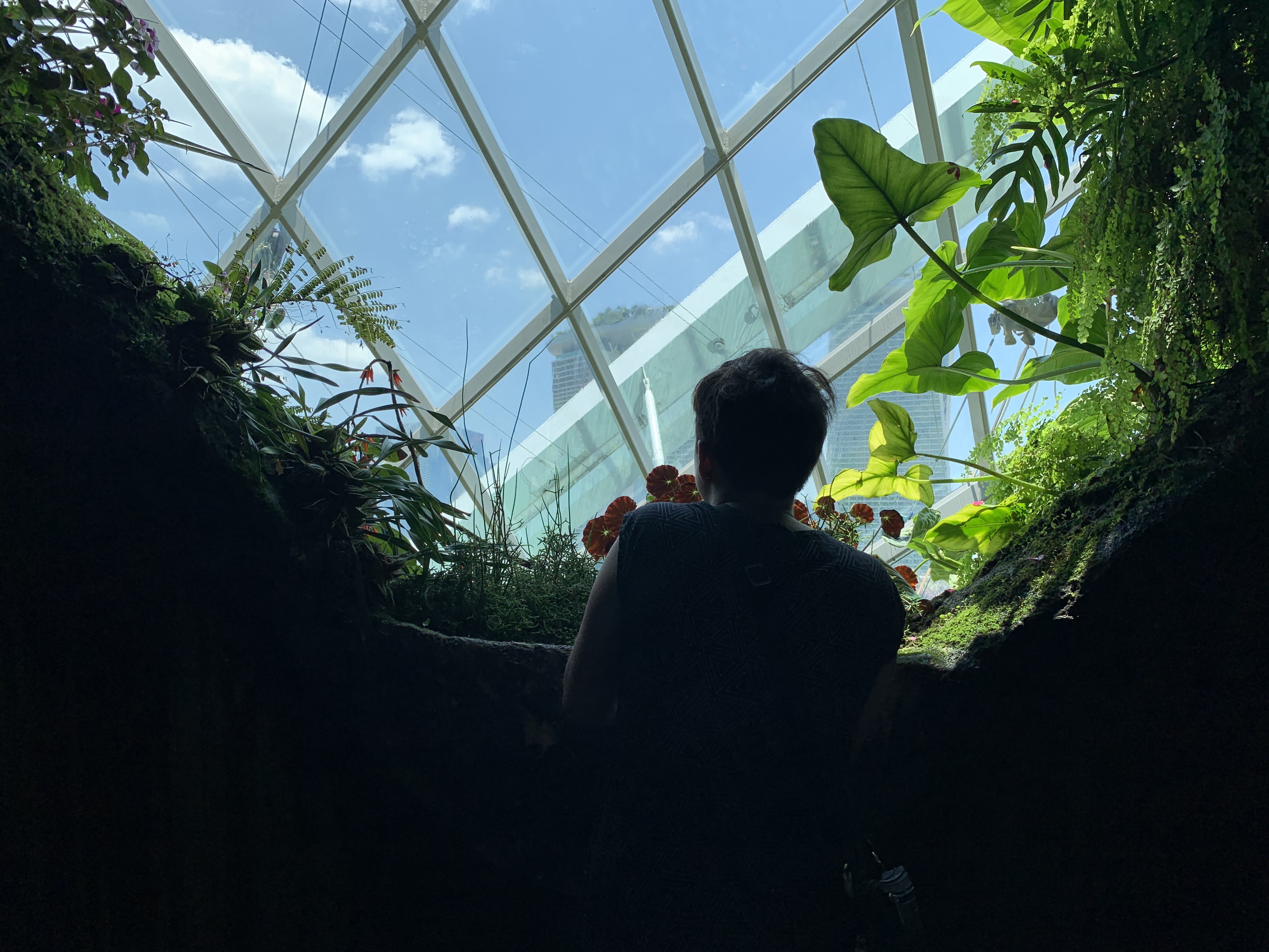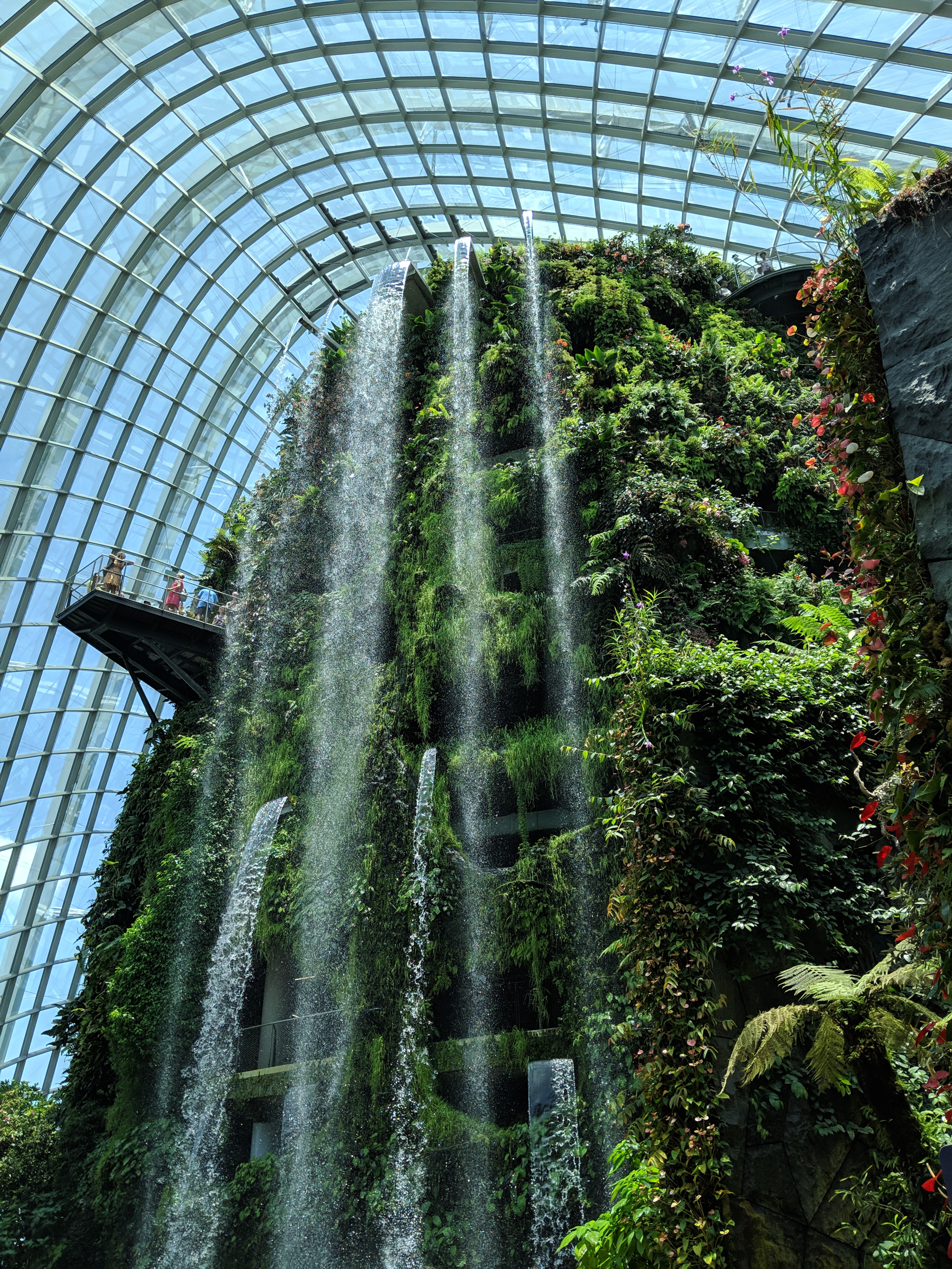To even access the Gardens, one must enter through the hotel. First is a view over the grounds from an elevated platform, then you deescalate and choose your own adventure! We took a tram over to the Garden Gnomes Domes, to check out the Cloud Forest, per Isabel’s research. Walking in, I’m ashamed that my first thought was, “Oh, this looks like we’re in the movie Bio-Dome.” It was really beautiful! When you first enter this gigantic greenhouse, you’re immediately welcomed by a cool mist and a view of this massive waterfall, forcing you to take notice of the sheer size of this rain forest conservatory.