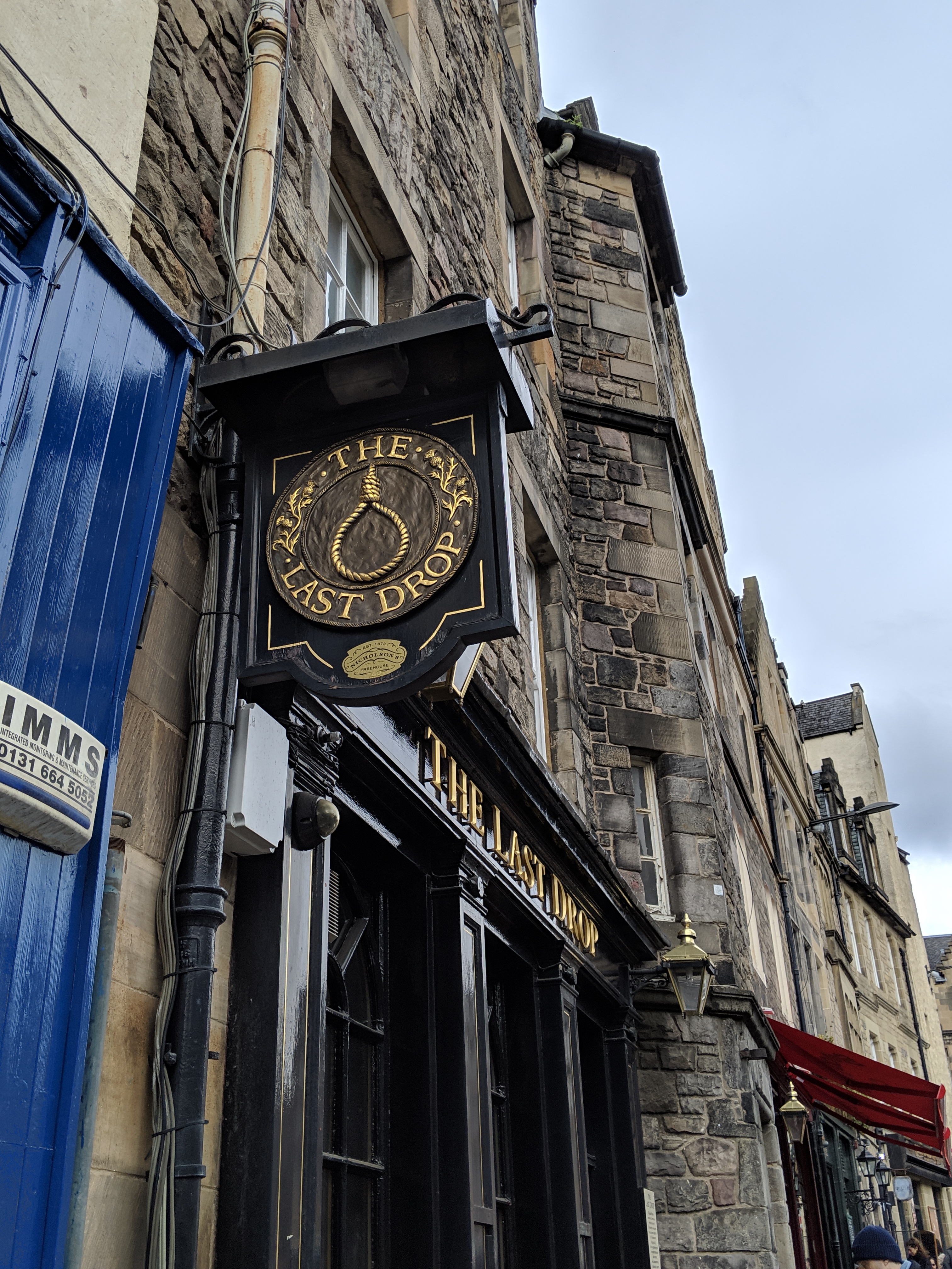 We roamed around the streets of Edinburgh’s Grassmarket District on the hunt for some lunch. Along the way we passed The Last Drop Tavern, situated at the same location as the main gallows from the 18th century, where crowds would pack Grassmarket Square to see public executions (The Last Drop, get it?). Eventually we found a reasonably-priced pub and chowed down on some authentic Scottish food. While I ate bangers and mash, Mark ordered a dish called stovies. Stovies is a dish that varies with each recipe but his had potatoes, onions, vegetables and meat. It was very good, quite hearty, and paired perfectly with a cold beer. Gary had a vegetarian version of haggis. If you don’t know what haggis is, well, you can find out here. Don’t say I didn’t warn you.