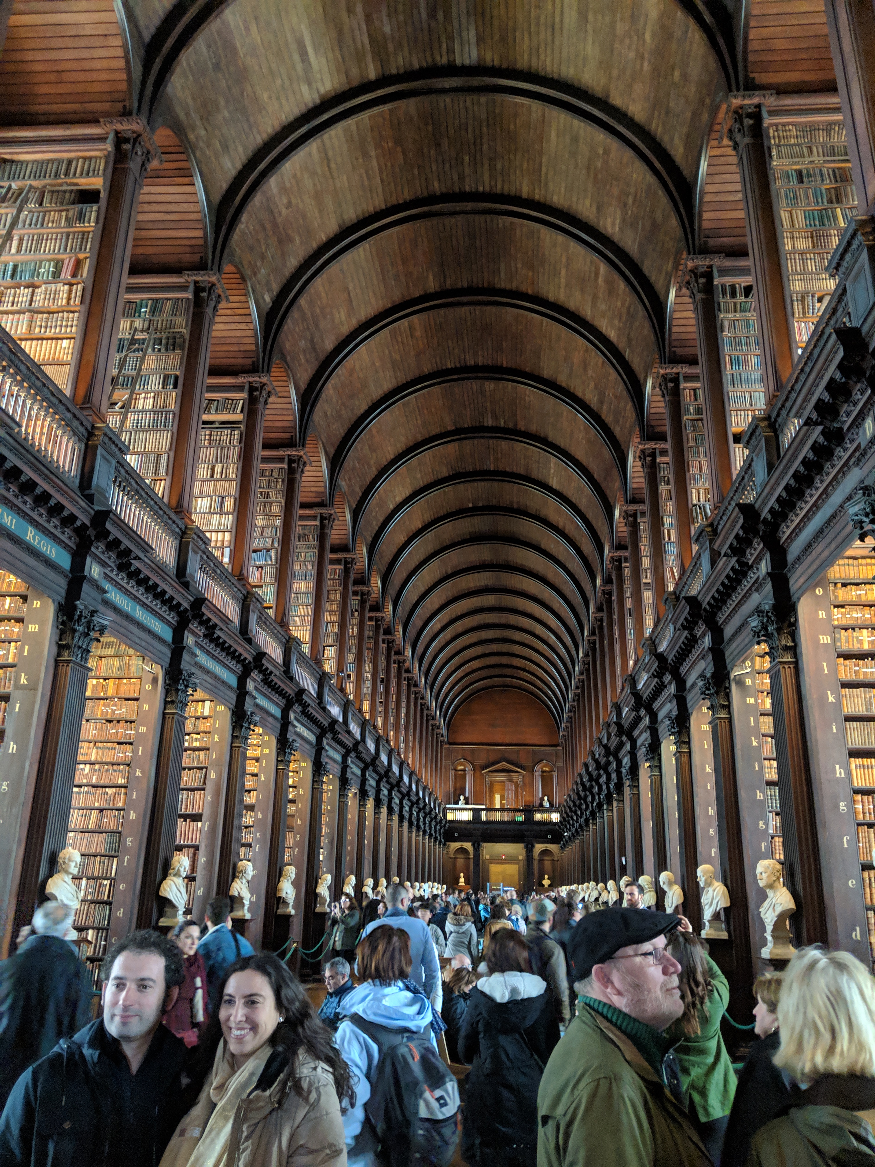 The Book of Kells contains writings and illustrations describing the four gospels of the New Testament and was created by monks at various monasteries throughout Ireland, England and Scotland. The illustrations, details, and celtic alphabet are absolutely stunning, and the curation of the exhibit is very well done. The actual book is open, encased in glass, displaying two pages to the public. The pages of the book are turned every night, so new visitors each day see something different from the day before. It takes almost a full year to get through the whole book!