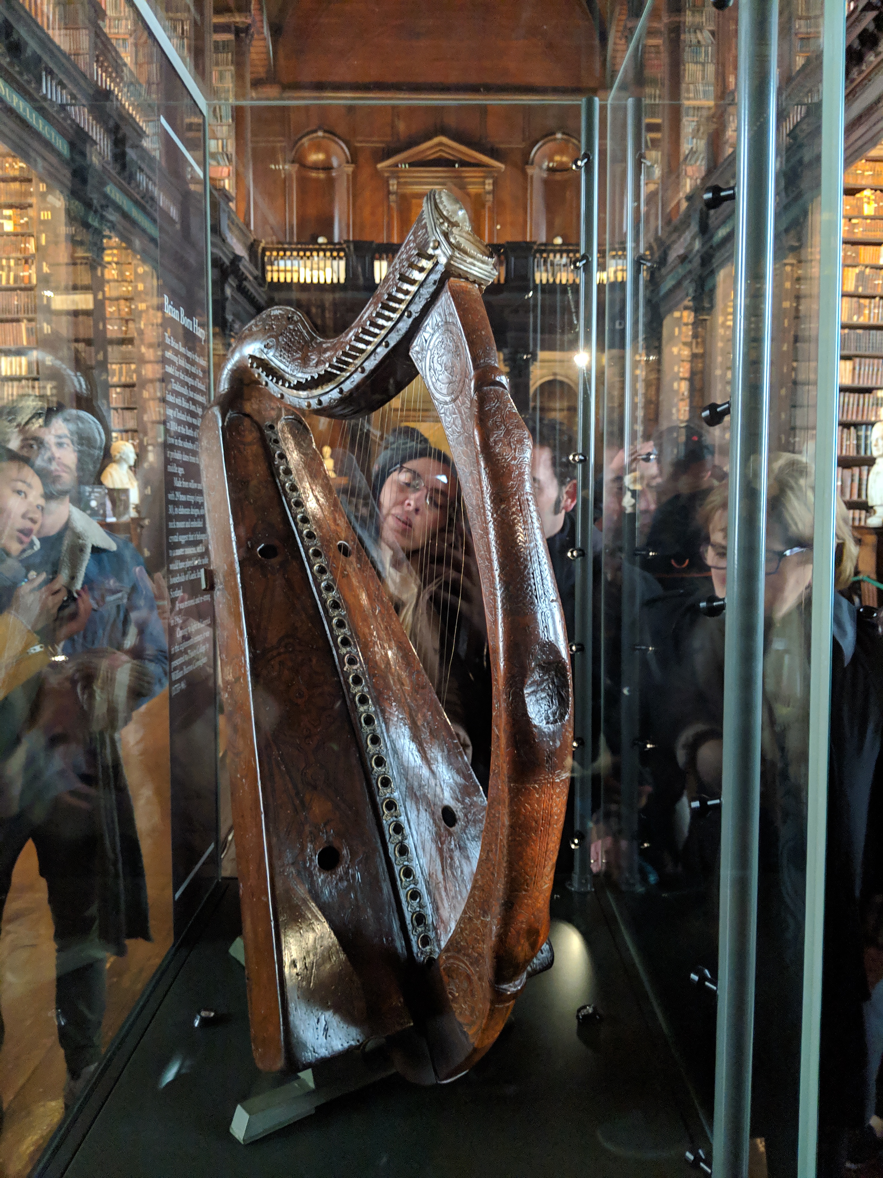 After the Book of Kells are two more famous items (albeit, slightly less so). The Long Room aka The Library of Trinity College Dublin is actually not the Hogwarts’ Library (that would be Oxford University’s library), though it is a “copyright” library. Publishers in Ireland must deposit a copy of all their publications there, free of charge. That’s a lot of books! They require off-premises warehouses to store all of these new books each year. Also in the library is the Brian Boru Harp. A harp is the symbol of Ireland and this particular harp was supposedly owned by Brian Boru, High King of Ireland. Blah blah blah, history, architecture, blah…okay, okay…the harp is also the Guinness logo. Fun fact #3 of this post: Guinness copyrighted the harp in 1862 as its logo. So when Ireland came to use it later on, they had to flip it around so as not to breach copyright law!
