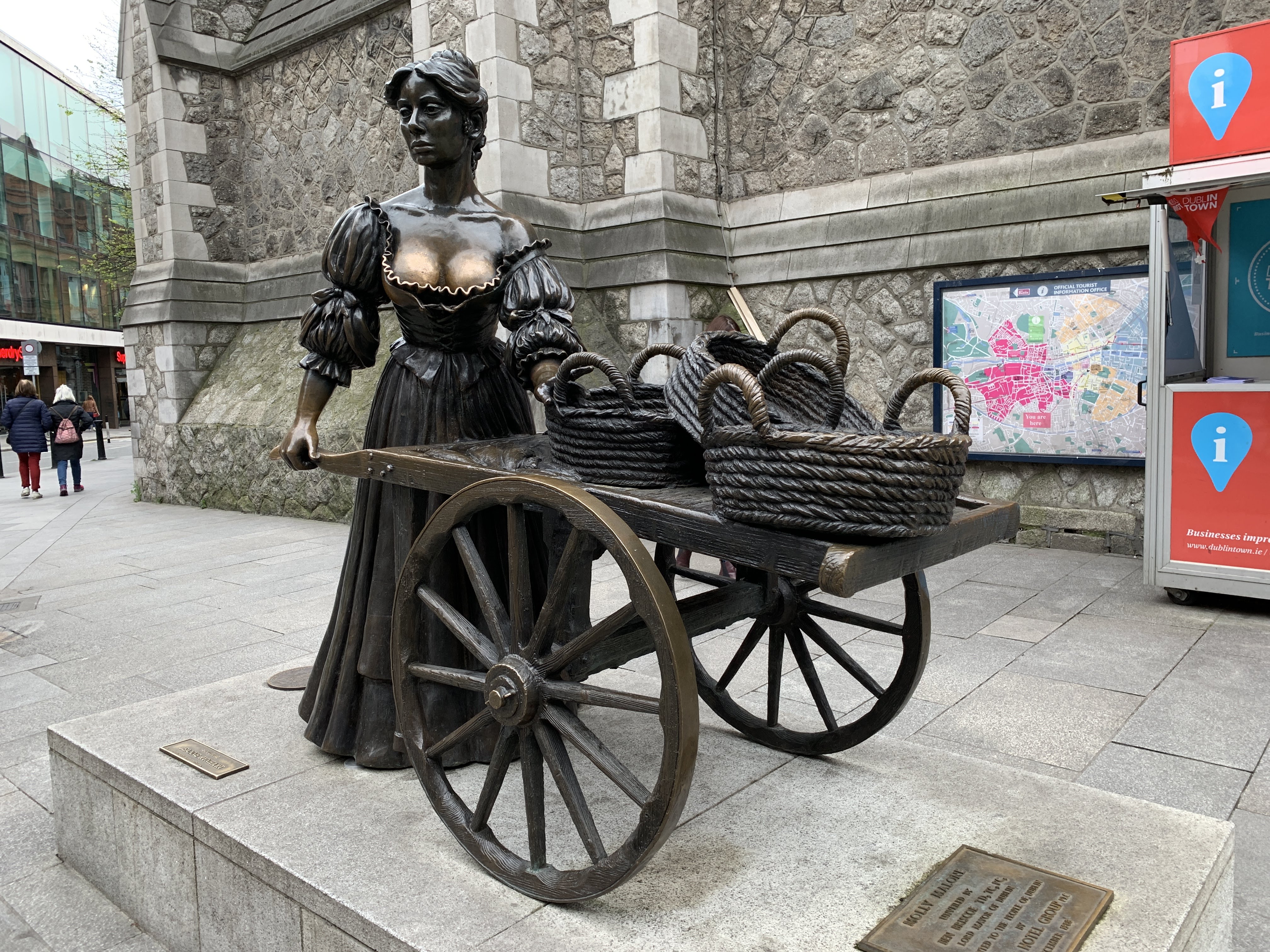 Around the corner from the Museum is the statue of Molly Malone. I felt like the name should have sounded familiar, but I couldn’t quite put my finger on it. I was relieved to discover why this was: Molly Malone wasn’t a real person. Lyrics from an 18th century song tell the tale of Molly Malone who worked two jobs; fish monger by day, prostitute by night. She remains a folk hero to this day, representing the Irish working class. The statue was erected over 30 years ago. It’s not uncommon for famous statues to be rubbed for good luck, however overzealous tourists and locals have become a bit handsy with Molly and have worn off some of the bronze hue, as seen below.