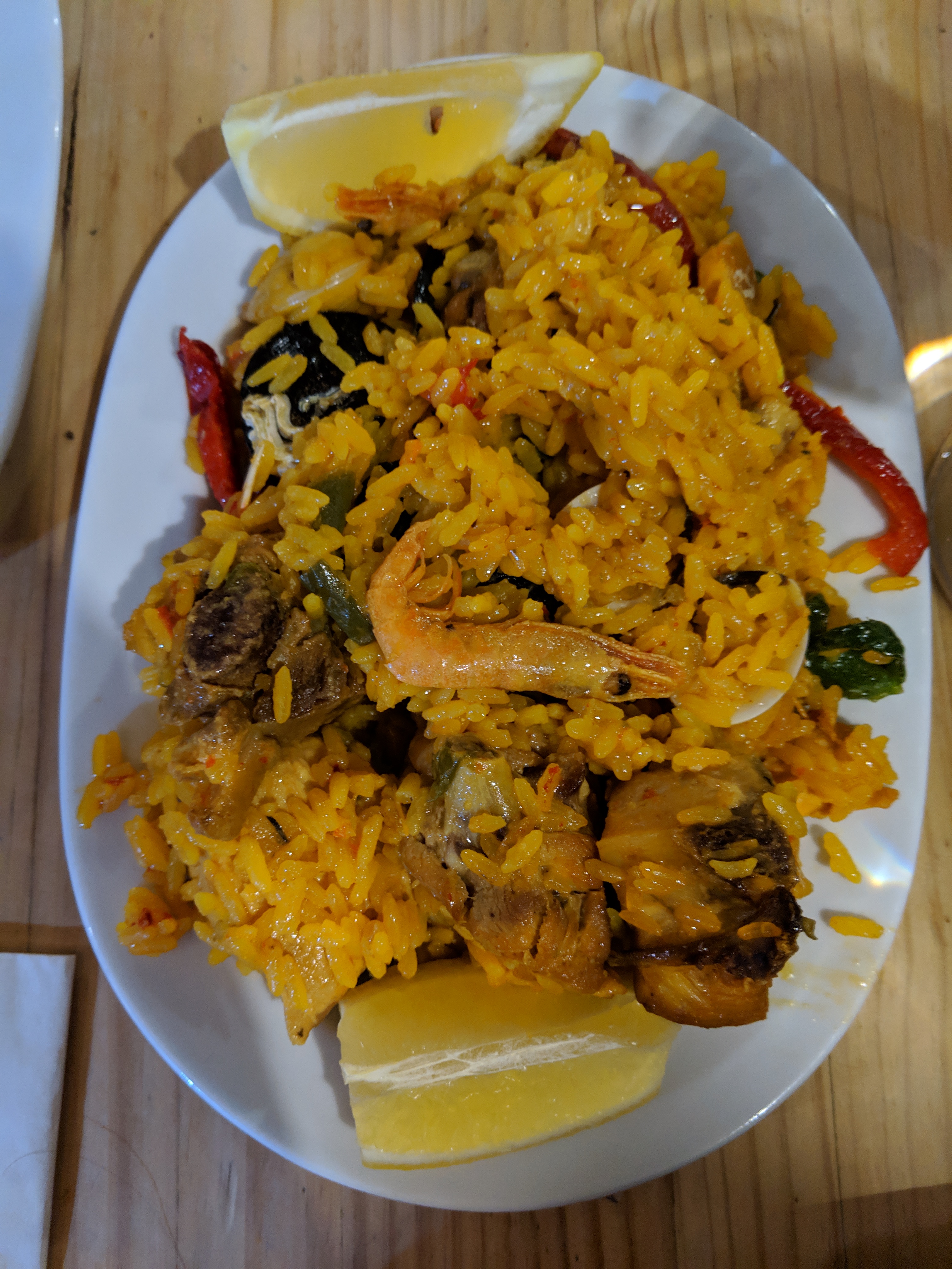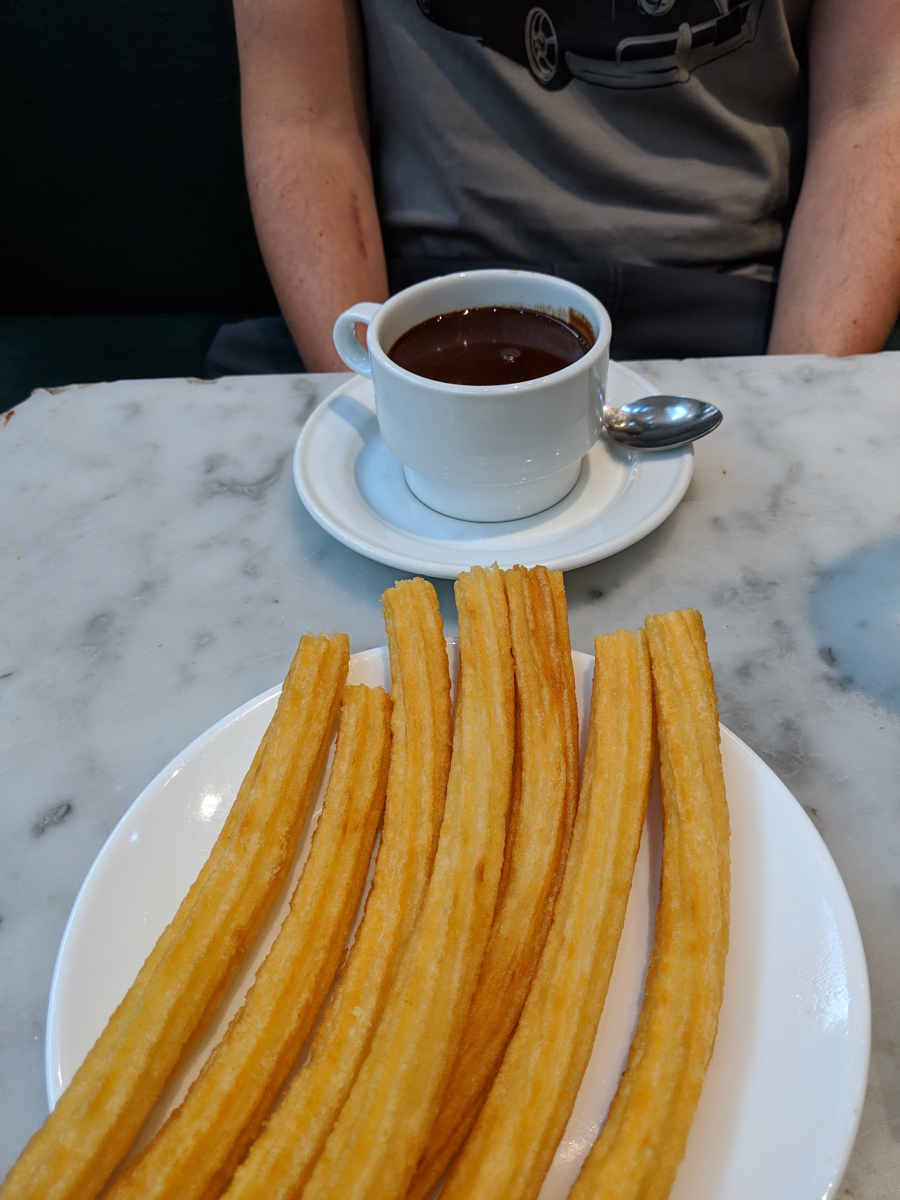 Lastly what helped make our time in Madrid so incredible was the food, our favorite combination of delicious and inexpensive. My ideal meal is to have a little taste of different things, which is basically the concept of tapas, so naturally I was in heaven. My friend Jocelyn told us to go to Pez Tortilla, for what she considers to be “the best tortilla in Madrid.” We walked over there one night, confused if it was going to be a taco or a quesadilla, and why she’d call it a tortilla. Naively, we went to this little bar that was packed with young people and ordered three tortillas from their menu. What we got were three giant slices of … Spanish tortilla. Likening it to a quiche or frittata wouldn’t do it justice, this dish made of egg, potato and onion is somehow cheesy, savory and addicting. So good (Thanks Jocelyn)! Another day for lunch we went to the famous Chocolatería San Ginés for churros and hot chocolate. Unsure if it was just a dipping sauce or supposed to be drank, we enjoyed it both ways. It was literally melted chocolate in a cup. One night we went to a tapas bar dinner and shared seafood paella and a meatball dish, the waiter brought us a free appetizer as well as digestifs!