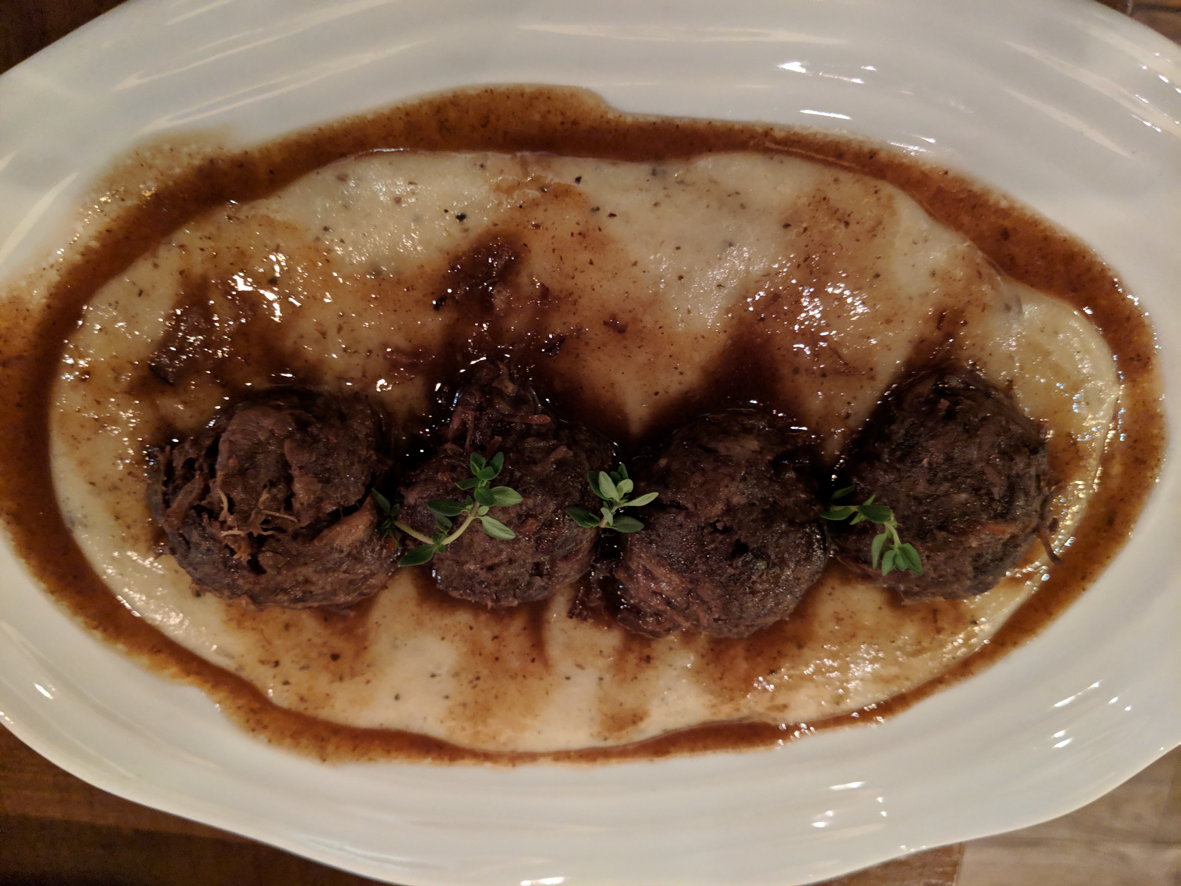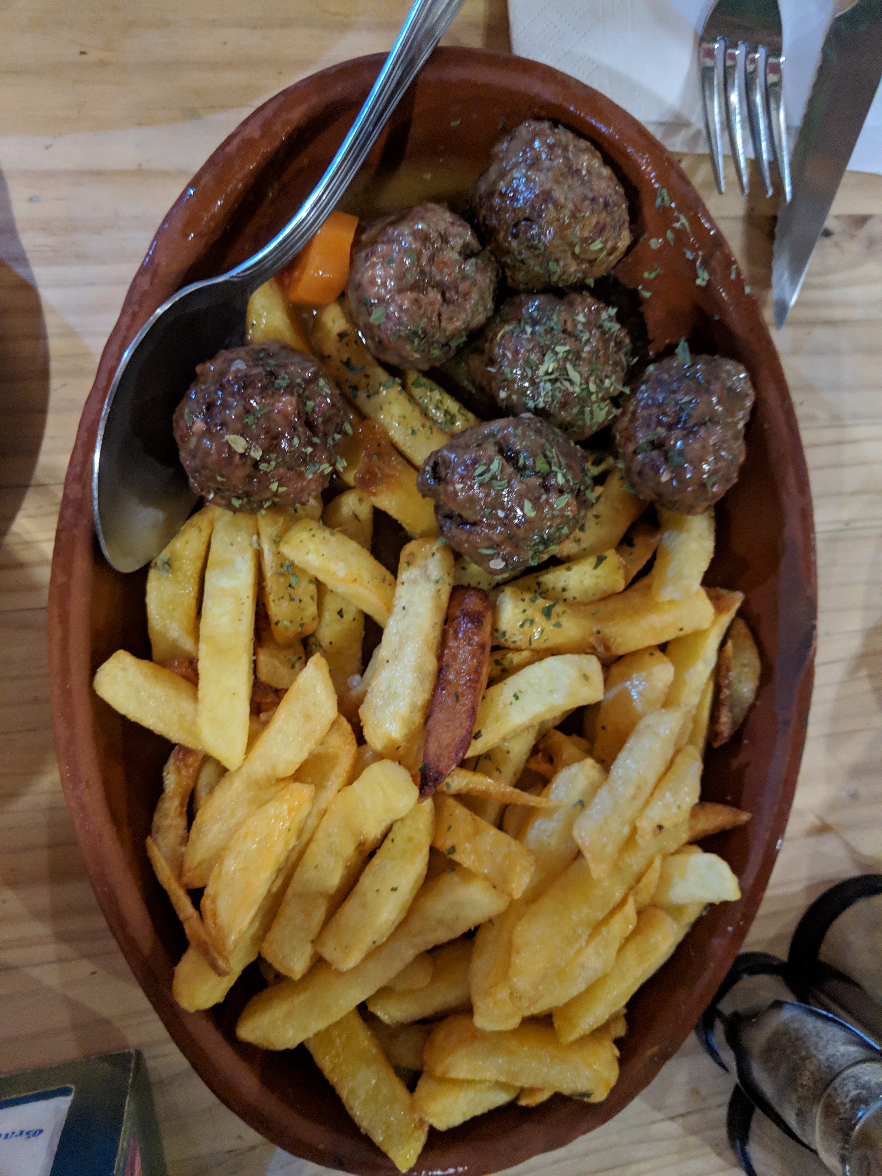 We ate more authentic cuisine for dinner at a local restaurant called Kalamata. We started with pan con tomate, (toasted bread with oil and tomatoes) and patatas bravas (potatoes with spicy sauce and mayo). Both were very simple, but very good. Our attempt at a healthy decision by ordering a salad was foiled when the dish came and it was a giant sphere of goat cheese surrounded by tomato slices, on the tiniest “bed” of lettuce. Naturally it was amazing, and we shared that along with oxtail meatballs over mashed potatoes. Everything was ¡muy increíble!