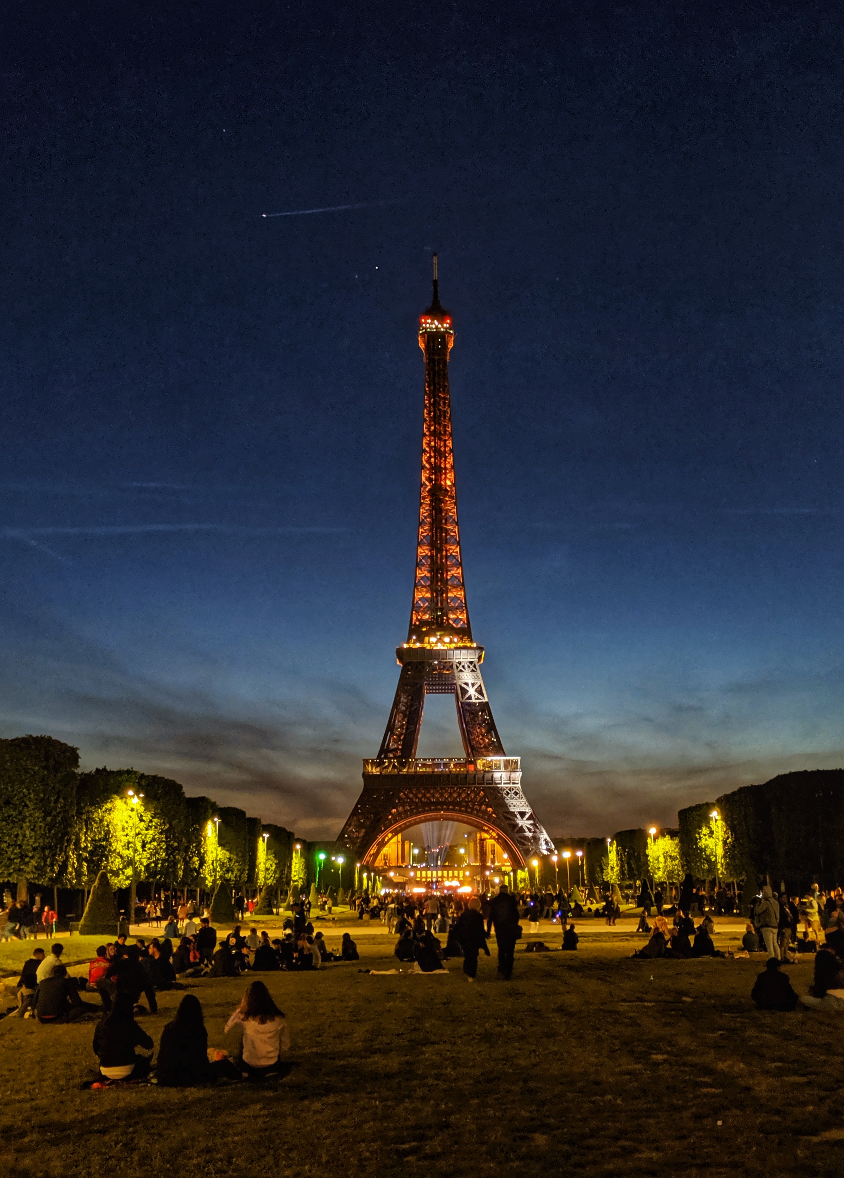 Now that we strolled around the hip Latin Quarter and got to see the Notre Dame, two of three items were crossed off my list. There’s only one other thing you must do before you leave Paris — see the Eiffel Tower at night. It wasn’t lit up in shimmering, glittery lights like I thought it would be (and like we saw from across the river on our journey home from dinner at Isabel’s cousins’), but it looked beautiful and majestic as always. We stood on the lawn admiring its presence and the vibe of the crowds sitting in different circles around us, some with wine, some with marijuana, some with kids. Regardless of your vice or joy in life, everyone equally revels in the splendor of Paris’ La Dame de Fer (Iron Lady).